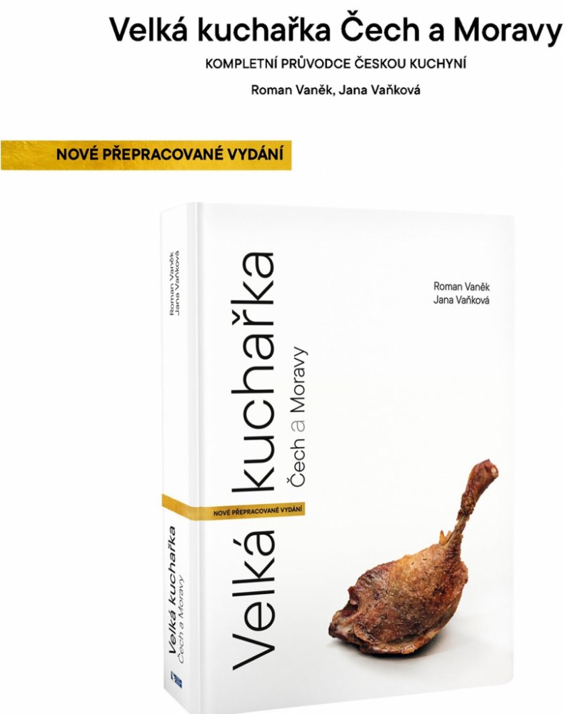 Kompletní průvodce českou kuchyní NOVÉ PŘEPRACOVANÉ VYDÁNÍ. Velká kuchařka Čech a Moravy od Romana Vaňka a Jany Vaňkové je nově přepracovaný kompletní průvodce českou kuchyní. Na četná přání vychází tato legendární kniha v novém formátu A4 „Bílé řady Vaňkových kuchařek.“ 524 přehledných a srozumitelně vysvětlených receptů, které krok za krokem provázejí celou přípravou každého pokrmu. Přepracované vydání obsahuje téměř 800 fotografií, stovky tipů, rad. Novinkou jsou odpovědi na nejčastější otázky, které lidé během vaření české klasiky hledají. Navíc je kniha rozšířena o přehledné váhové tabulky často používaných surovin, které jednoduše převádí lžíce, lžičky a gramy. „Nová“ Velká kuchařka Čech a Moravy je bez nadsázky nejlepší českou kuchařkou současnosti, napsaná pro začátečníky, ale inspirativní i pro profesionály. Vše zásadní z české kuchyně najdete v jedné knize, která reflektuje nejen tradici, ale i současnou národní kuchyni.