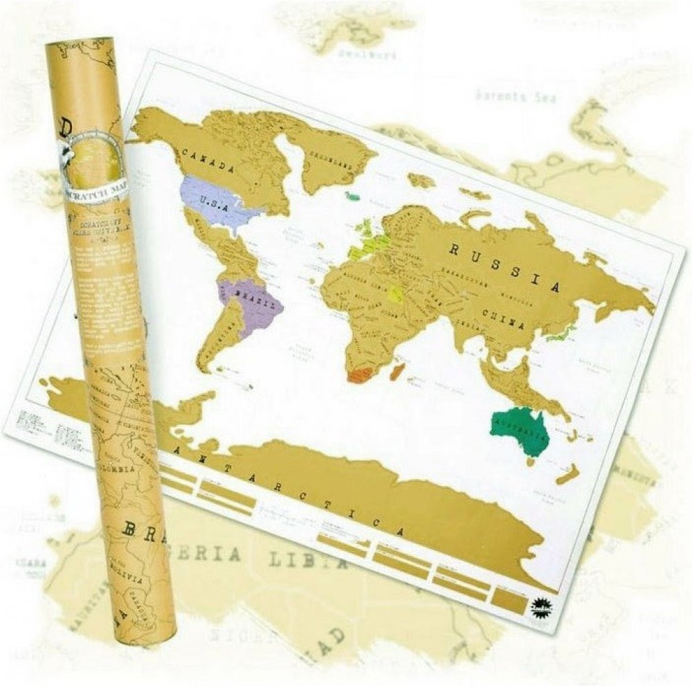 velká stírací mapa světa v bílém provedení s vyznačenými státy s detailnějším vykreslením pokrytá stírací hliníkovou folií a uložená v originálním dárkovém kartonovém tubusu