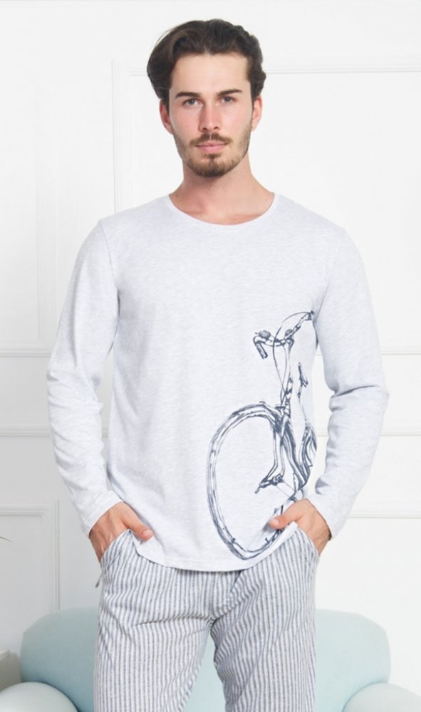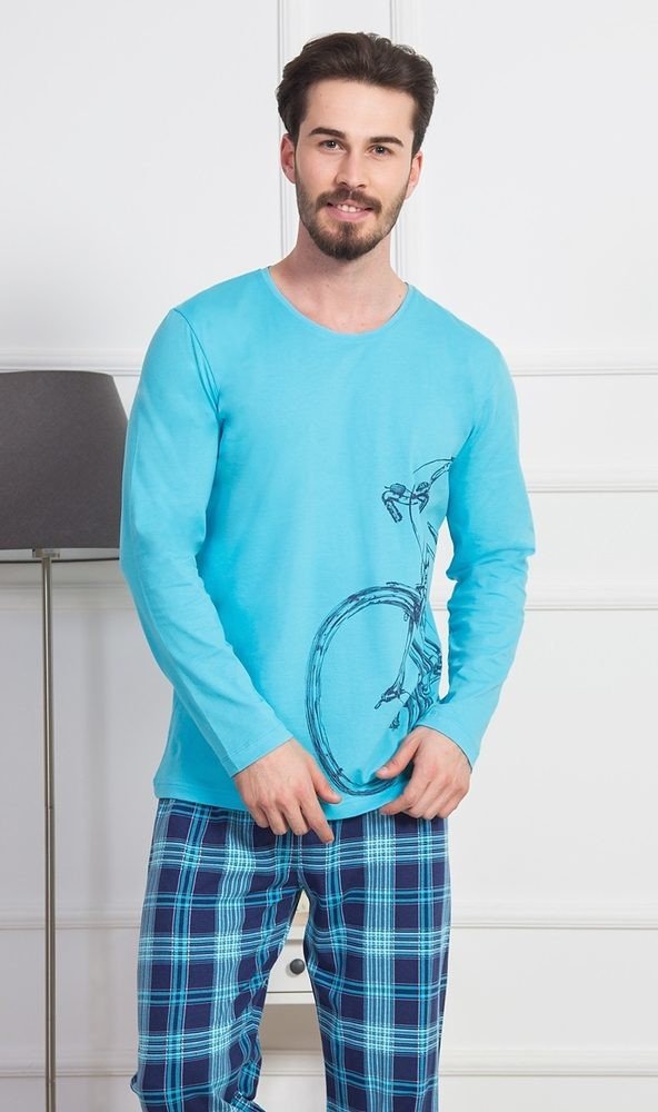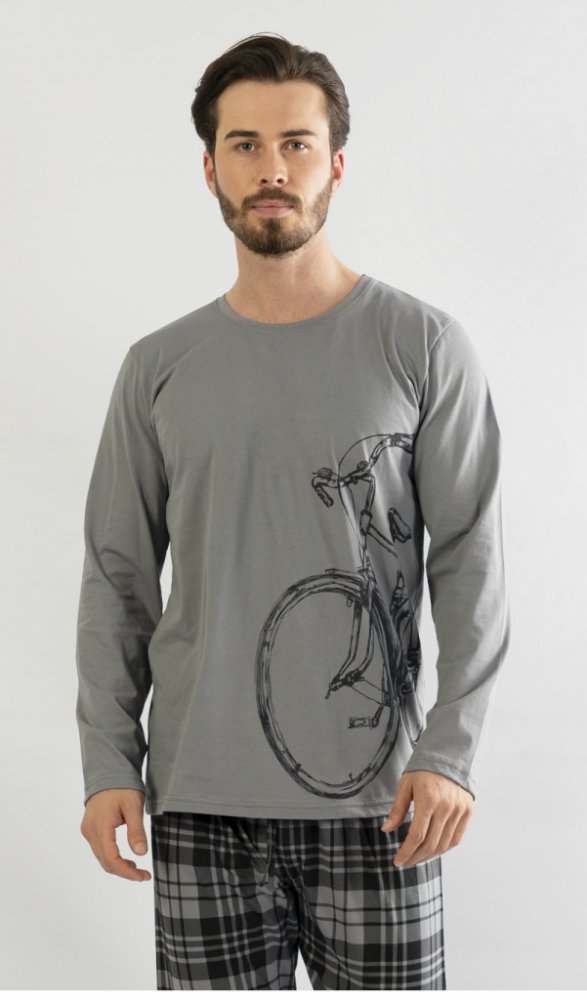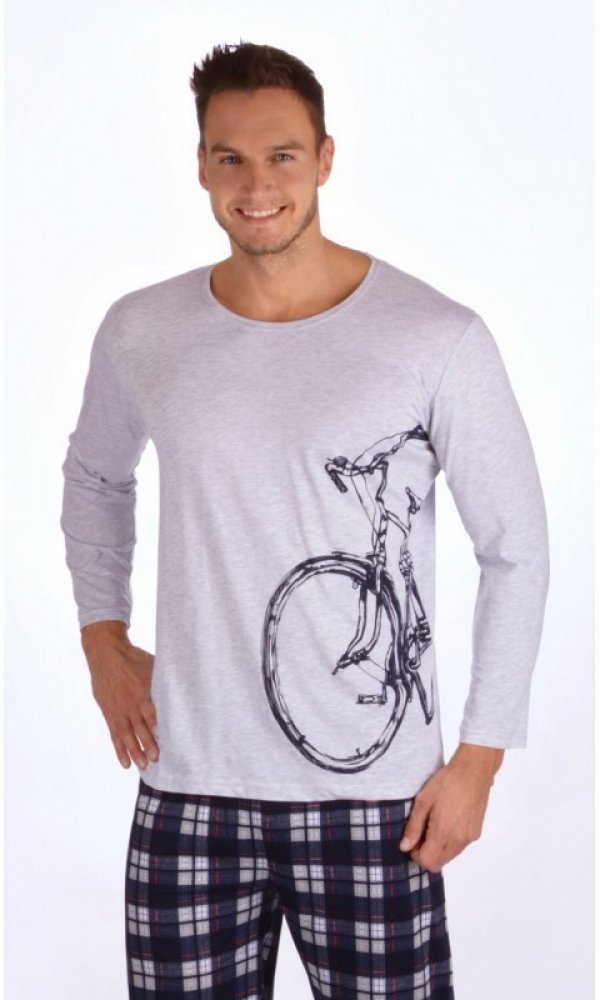 Pánské dlouhé bavlněné pyžamo Velké kolo. Pyžamo tvoří triko s dlouhým rukávem a dlouhé kalhoty s klasickým pasem. Triko zdobí velký potisk jízdního kola. Pánské pyžamové kalhoty jsou v pase na gumu a se šňůrkou na stažení. Kostkované dlouhé kalhoty mají na bocích všité kapsy. Bavlněný materiál je poddajný a jemný na dotek. Pyžamo je vhodné i na denní nošení.