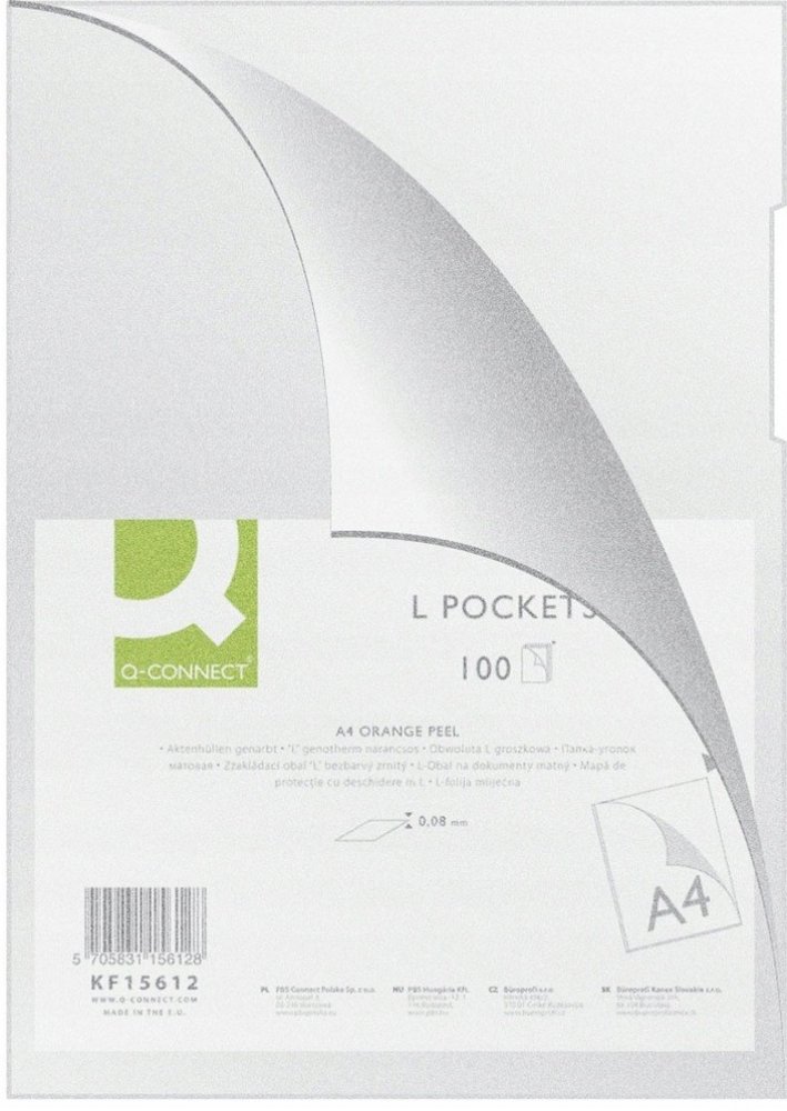 * prodejní jednotka: balení 100 * vyrobeno z polypropylenové fólie o tloušťce 80? m * hrachová, transparentní * ve tvaru písmene „L“ – rozparek nahoře a podél okraje * se zaobleným horním rohem * rozměr: 217 x 307 mm * barva: transparentní