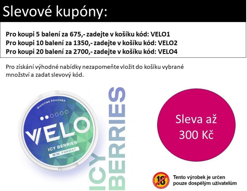 Každé balení VELO obsahuje 20 nikotinových sáčků, vyrobených bez příměsi tabáku. Původní nápad ze Švédska obsahuje pouze nikotin, vodu, příchutě a vlákna, která drží konzistenci. Nikotinové sáčky VELO se vyznačují extrémní jednoduchostí používání. Jednoduše umístíte sáček pod horní ret a necháte jej tam po dobu 5-10 minut, než pocítíte nástup nikotinu. Každý sáček můžete používat až po dobu 30 minut.