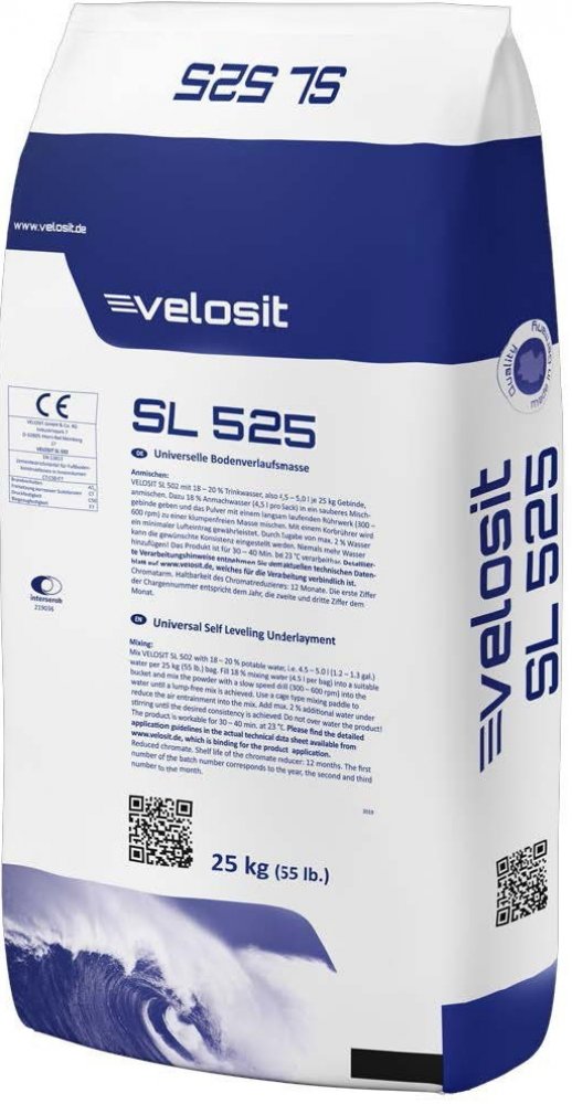 SAMONIVELAČNÍ INTERIÉROVÁ VYROVNÁVACÍ HMOTA PRO KOBERCOVÉ, VINYLOVÉ A LAMINÁTOVÉ PODLAHY VELOSIT SL 525 je cementová vyrovnávací hmota pro beton, anhydrit, magnézium a lité asfaltové podklady s velmi rychlým vývojem pevnosti. Vytváří velmi hladké povrchy pro nátěry a podlahové krytiny. Typické oblasti použití zahrnují: vyrovnání podlah a opravy povrchových vad na betonových plochách. Lze zpracovat vrstvu od 1 do 12 mm. Tvoří pevně spojenou, velmi rovnou plochu povrchu.