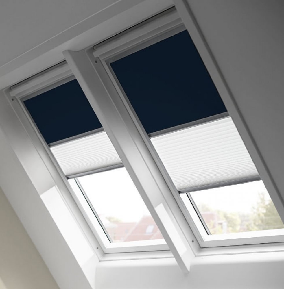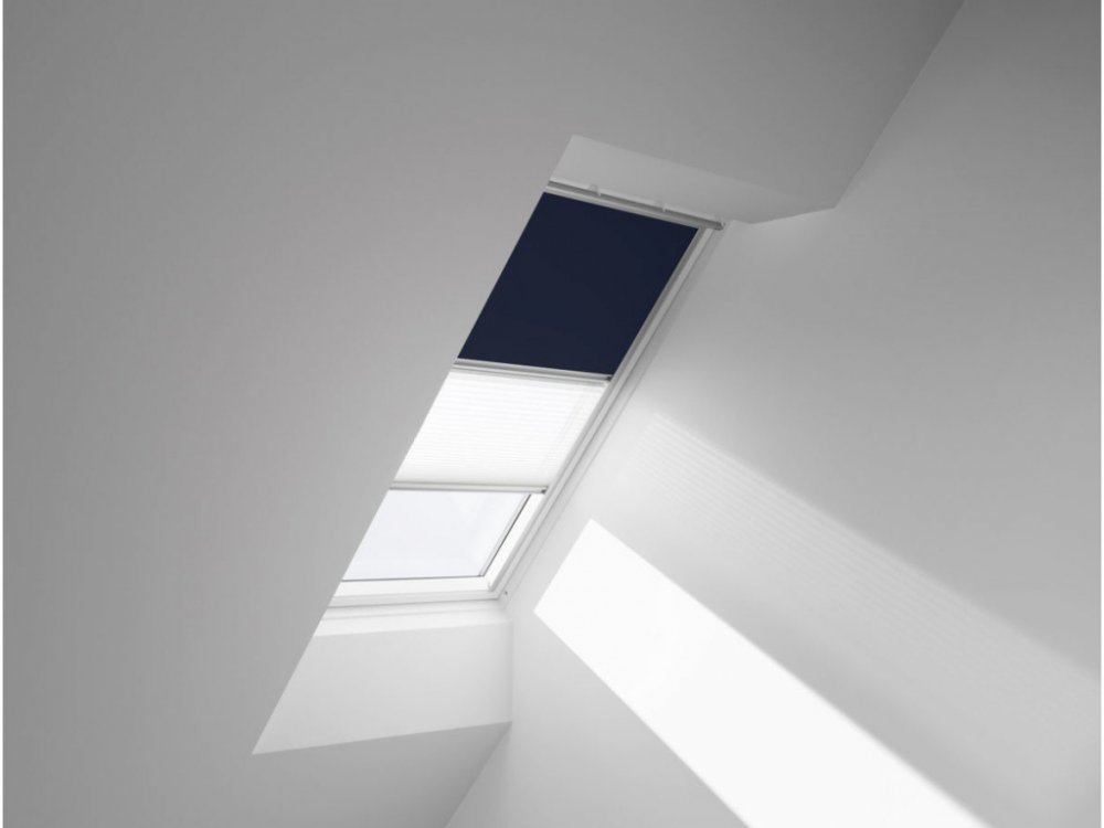 Vyberte si jeden ze čtyř atraktivních barevných provedení zcela zatemňující rolety Velux DKL s kombinací s bílou plísovanou roletou. Stříbrná hliníková vrstva na zadní straně zcela zatemňující rolety brání průniku světla do místnosti i tepelným ztrátám v zimním období.