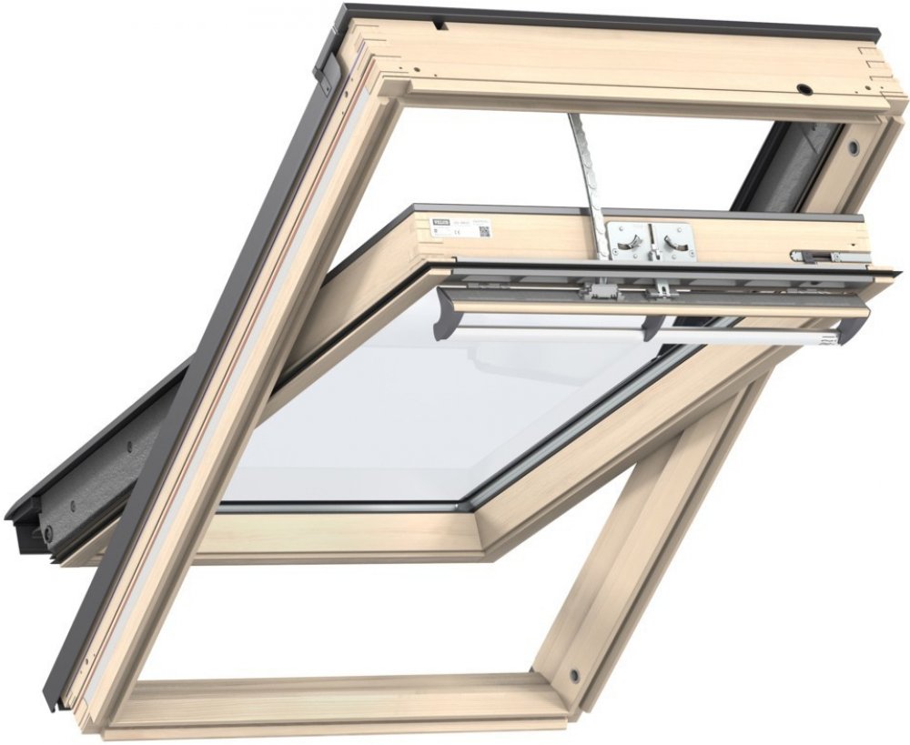 Střešní okno s elektrickým pohonem VELUX GGL 306821 Integra, energetické trojsklo, dálkové ovládání s dotykovým displejem, dešťový senzor, bezpečné samočistící trojsklo se samočistícím účinkem a ochranou proti rosení, kyvné otevírání s pojistkou, ventilační klapka, přírodní lakované dřevo. Okno GGL Integra s hliníkovým oplechováním a systémem doplňků VELUX.