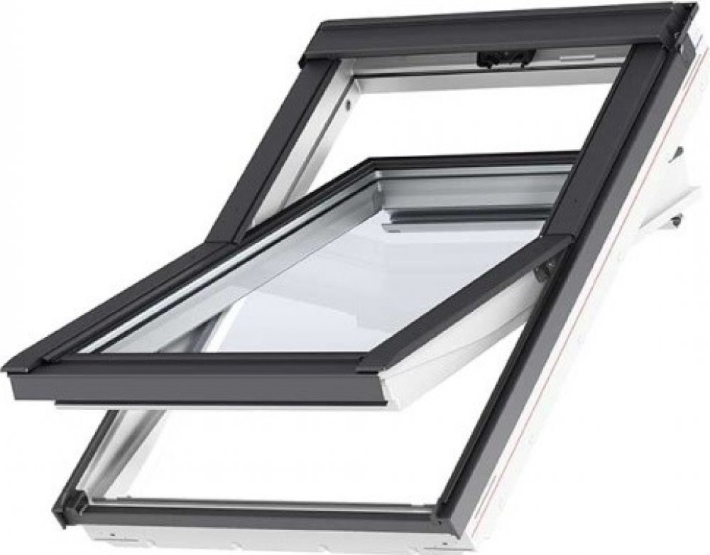 Kyvné střešní okno v bílém bezúdržbovém polyuretavovém provedení se spodním ovládáním.