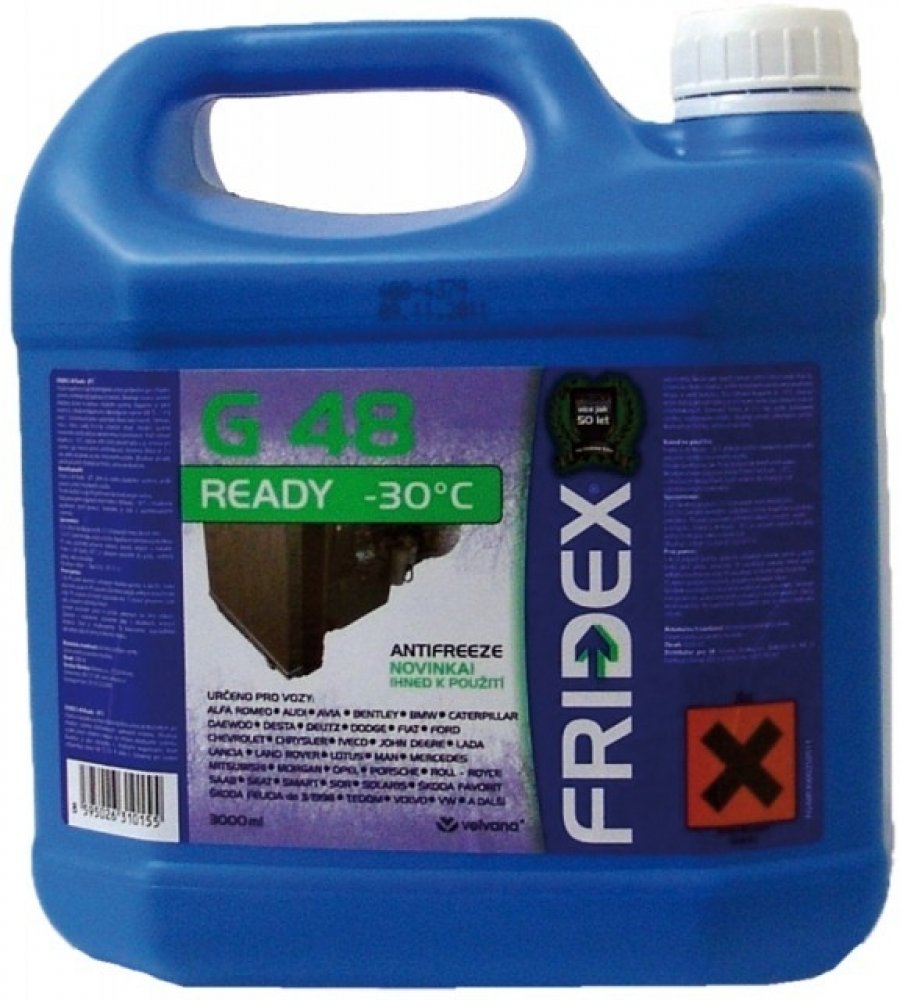 Koncentrovaná chladicí kapalina na bázi ethylenglykolu, obsahuje vysoce účinné inhibitoři koroze pro ochranu chladicího systému. Výměnná doba je 2 - 3 roky (dle doporučení výrobce motoru. vozidla). Chladicí kapalina FRIDEX® G 48 je mísitelná a plně identická s originální chladící kapalinou Škoda G 11.Produkt je certifikován akreditovanou zkušební laboratoří 1152.1.