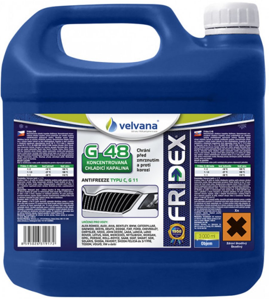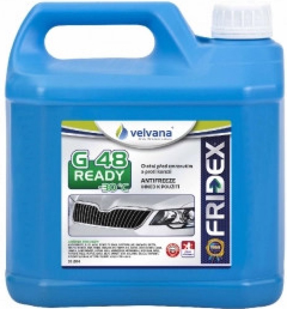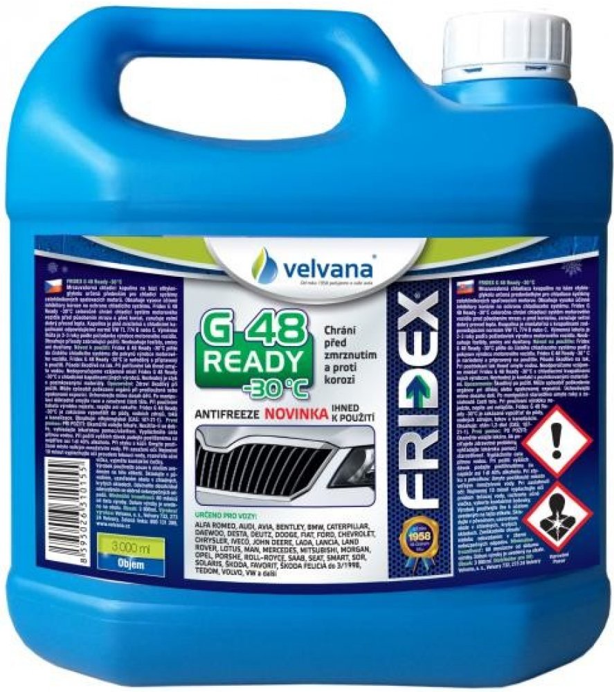 Charakteristika: Chladicí kapalina na bázi ethylenglykolu určená především pro chladicí systémy celohliníkových spalovacích motorů. Obsahuje vysoce účinné inhibitory koroze na ochranu chladicího systému. Kapalina je plně mísitelná s chladicími kapalinami odpovídajícími normě VW TL 774 B nebo C. Schválená pro osobní automobily Škoda řady Favorit, Forman, Felicia, Felicia Combi, Pick-Up. Celoročně chrání chladicí systém motorového vozidla před působením mrazu a před korozí. Bod tuhnutí kapaliny je –30°C. Zaručuje velmi dobrý převod tepla a je určena pro všechny typy motorů včetně celohliníkových. Výměnná lhůta je 2-3 roky podle požadavku výrobce motorového vozidla. Obsahuje přísady zabraňující požití. Neobsahuje fosfáty, aminy ani dusitany. Použití: Fridex G 48 Ready –30°C plňte do čistého chladicího systému podle pokynů výrobce motorového vozidla. Působí škodlivě na lak. Při potřísnění lak ihned omyjte vodou. Nedoporučujeme vzájemně mísit Fridex G 48 Ready –30°C s chladicími kapalinami jiných výrobců. Nevhodný je styk s pozinkovanými materiály. Vzhled: Fridex G 48 Ready –30°C je čirá, tmavozeleně zbarvená kapalina, bez zápachu, hořké chuti. S vodou je mísitelný v každém poměru. Fridex G 48 Ready –30°C je směs 1,2-ethandiolu (monoethylenglykol = MEG = Ethan-1,2-diol = ethylenglykol) s organickými i anorganickými inhibitory koroze, stabilizátorem, odpěňovadlem a přísadou proti požití. Neobsahuje fosfáty, dusitany ani aminy.