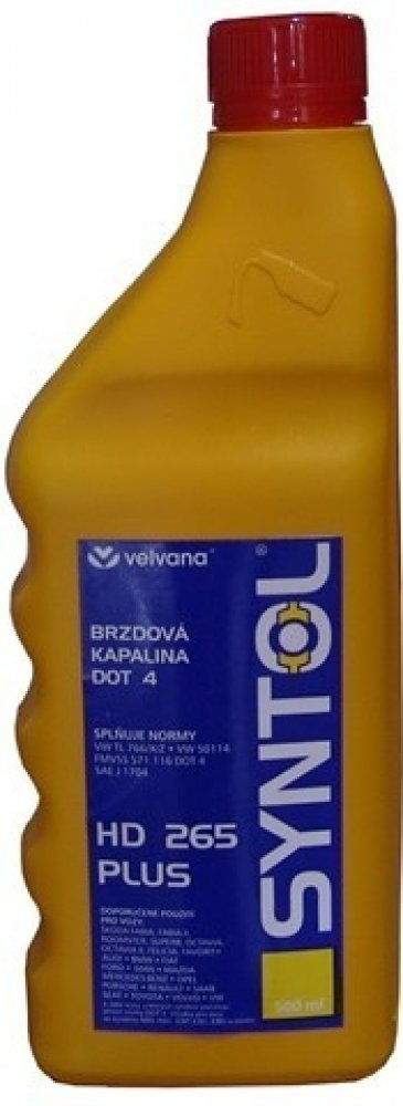 Nejmodernější brzdová kapalina se používá pro všechny druhy kotoučových a bubnových brzd. Má výborné mazací schopnosti a stabilní fyzikální a chemické vlastnosti. V náročných provozních podmínkách zabraňuje vzniku plynových bublin, které způsobují selhání brzd. SYNTOL HD 265 PLUS je určený pro provoz v teplotním rozmezí od -50°C až do 265°C.
