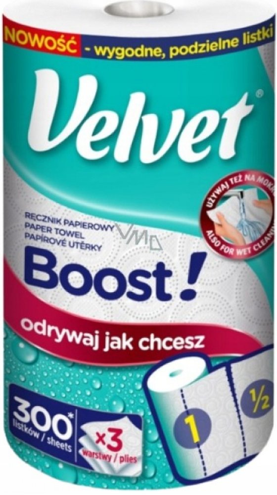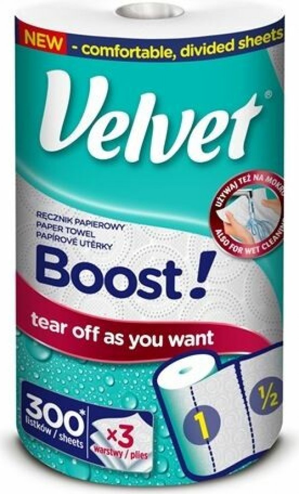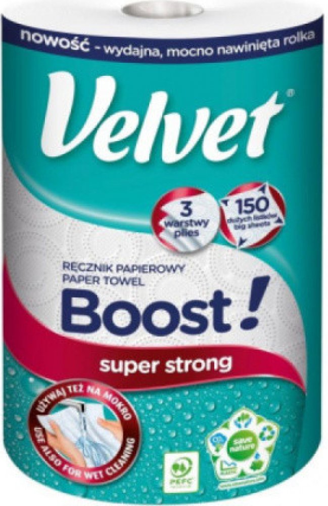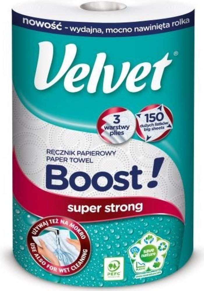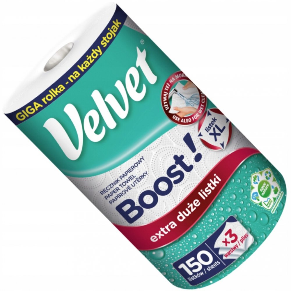 150 extra velkých listů, pevně navinutých na jedné tenké roli Giga. Papírový ručník Boost je vyroben ze tří vrstev extrémně odolného superabsorpčního hedvábného papíru. Díky tomu se skvěle hodí pro suchou i mokrou práci. Díky maximální velikosti listů je ručník velmi účinný a déle vydrží. Díky vhodné velikosti role se produkt vejde do každé, i malé kuchyně. Boost je vytvářen s ohledem na životní prostředí. Je vyroben ze 100% celulózy, pocházející ze zcela obnovitelných zdrojů, krytý mezinárodními certifikáty pro odpovědné a udržitelné lesní hospodářství. Vlastnosti kuchyňských utěrek Velvet: - velmi účinný- vydrží déle- třívrstvé- 150 útržků- složení 100% celulóza