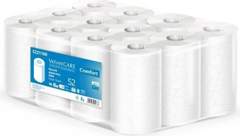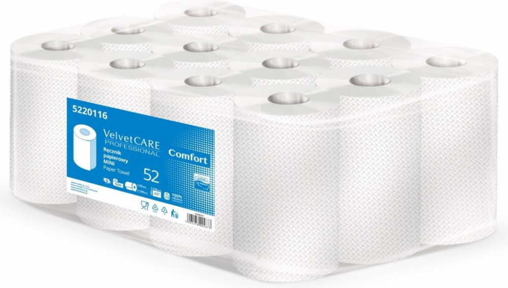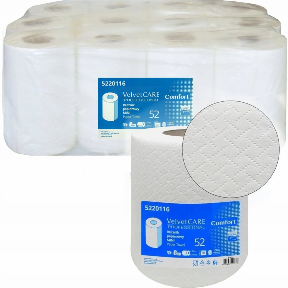 Papírové ručníky v roli Velvet Professional - 2vrstvé, bílé, 52 m, 12 rolí100% celulóza2vrstvýNávin 52 mRozměr útržku 19x 23,0 cmPrůměr role 6,5 cmPočet útržků 227Možnost středového odvíjeníKaždá role je samostatně balenáBalení obsahuje 12 rolí