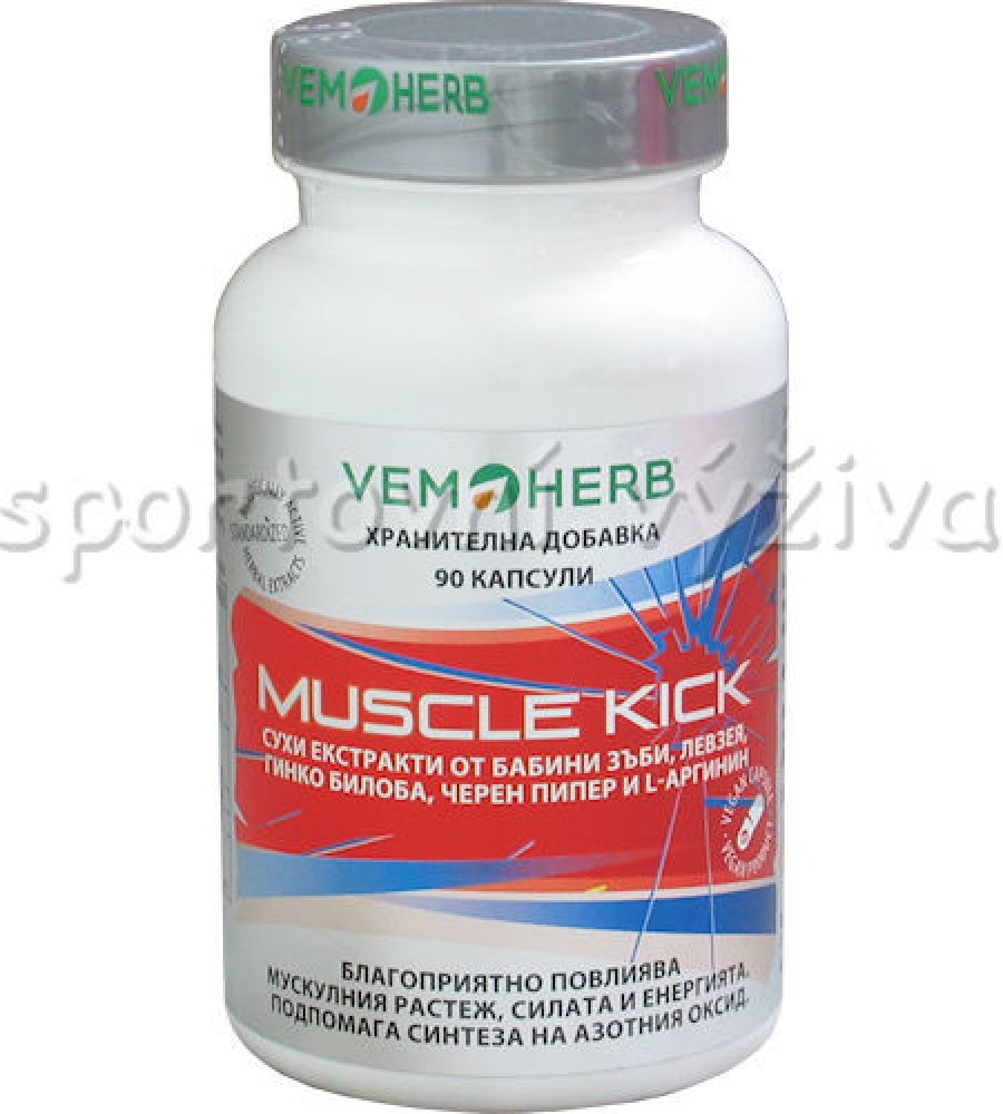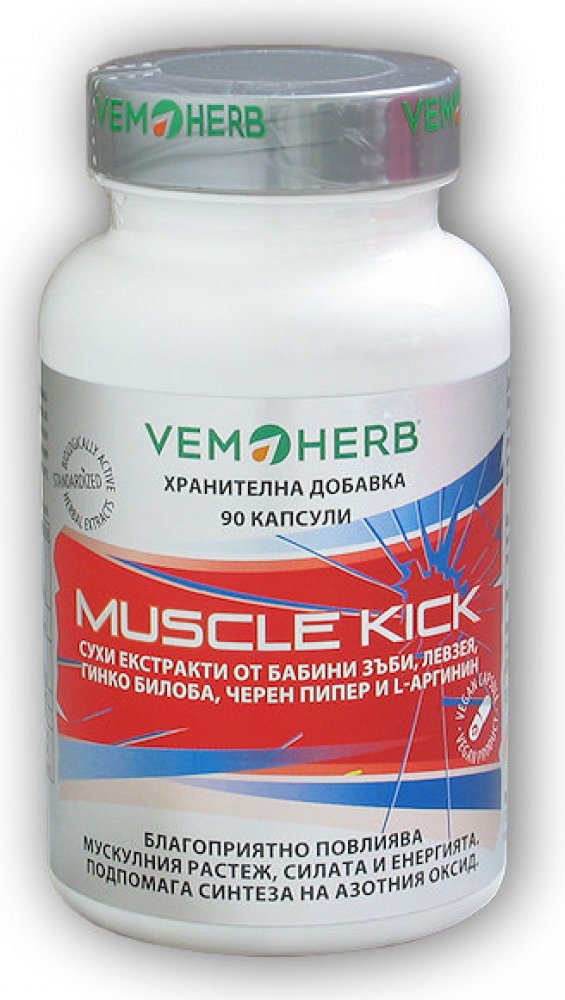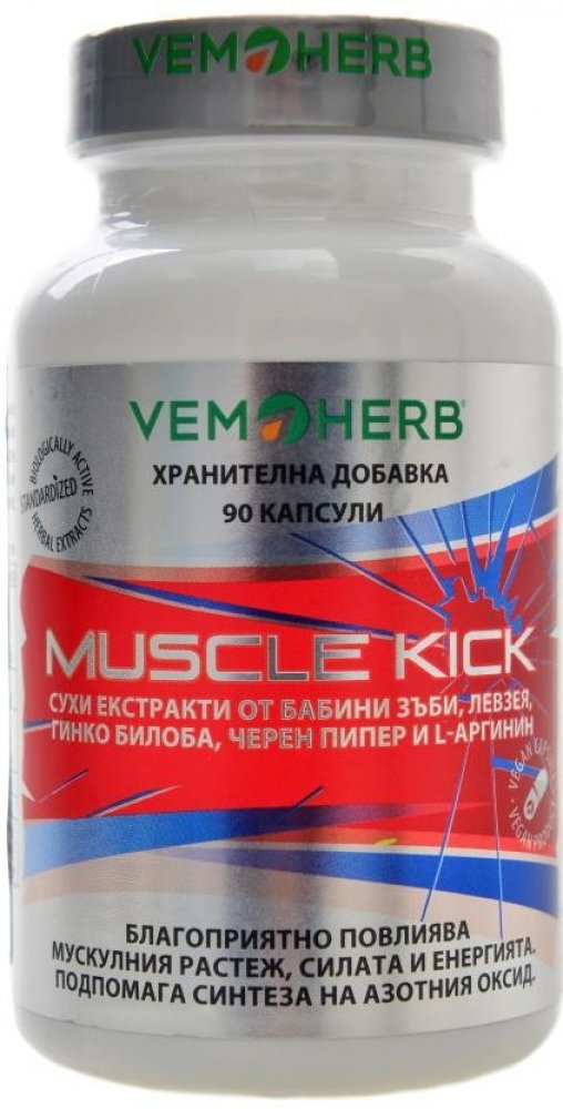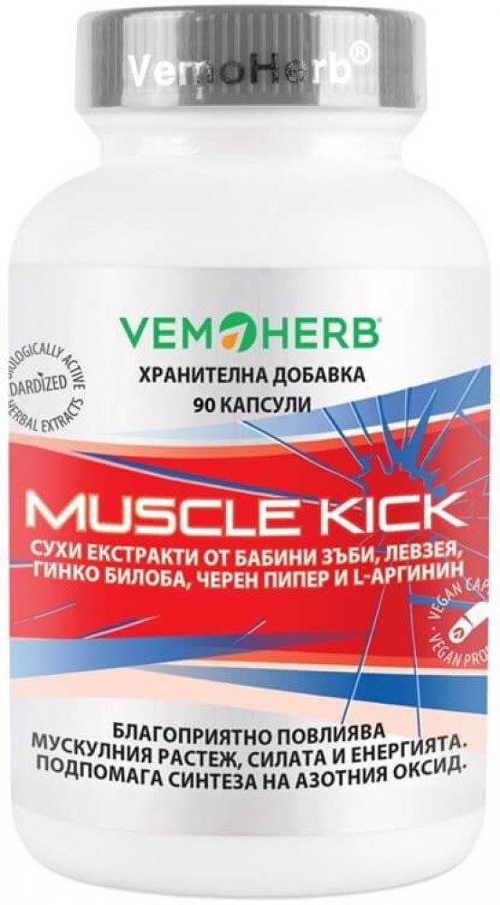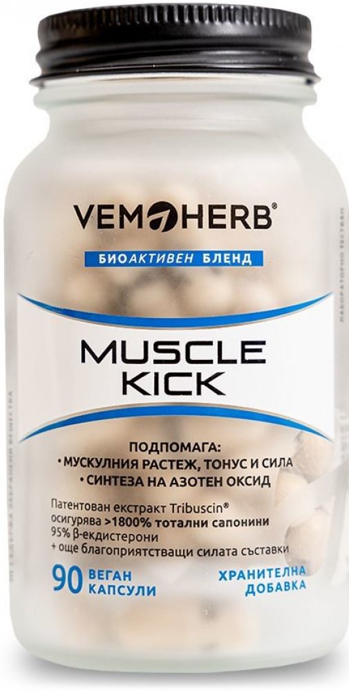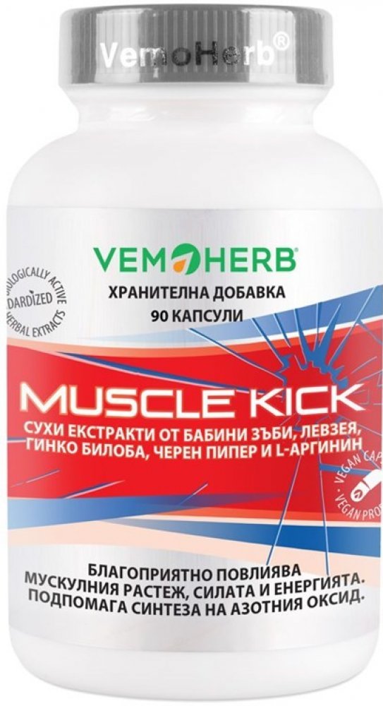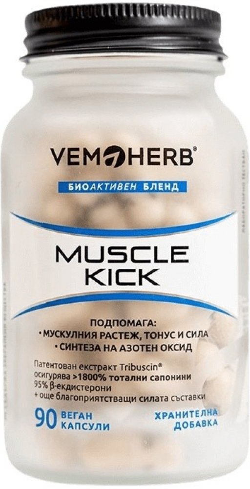 Další doplněk z dílny VemoHerb zaměřený na přírůstek svalové hmoty, její regeneraci a udržení. Obsahuje extrakt z Bulharského Tribulu, Leuzeu (beta-ekdysteron), extrakt z ginkga, l-arginin a extrakt z plodů černého pepře. Díky synergnímu působení těchto složek je Muscle Kick účinným produktem, který lze doporučit každému, kdo chce efektivně podpořit svalový růst.