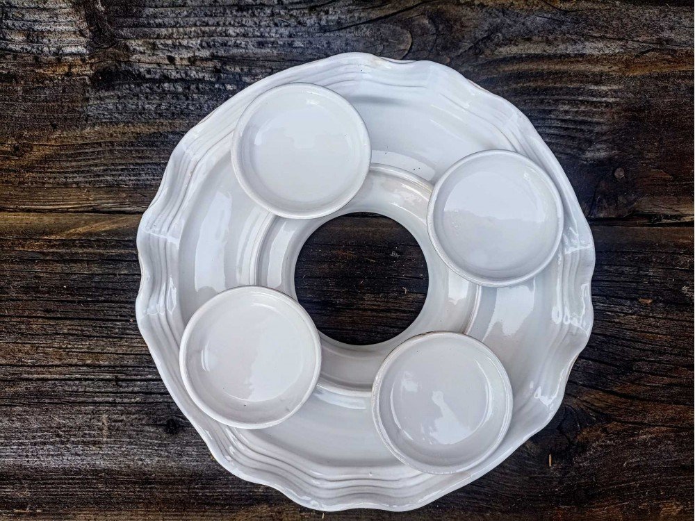 Vánoční korpus věnce. Věnec se žlábkem na vodu. Adventní věnec se aranžuje živým chvojím pod bezpečnou misku na svíci, tak aby konec větvičky byl ponořen ve žlábku,který se zaleje vodou. Chvojí ve vodě vydrží mnohem déle a pryskyřice provoní celý byt.A tak pro mne začíná adventní čas,a čas vánočního zklidnění a rozjímání.Keramický adventní svícen by neměl chybět ani u vás.