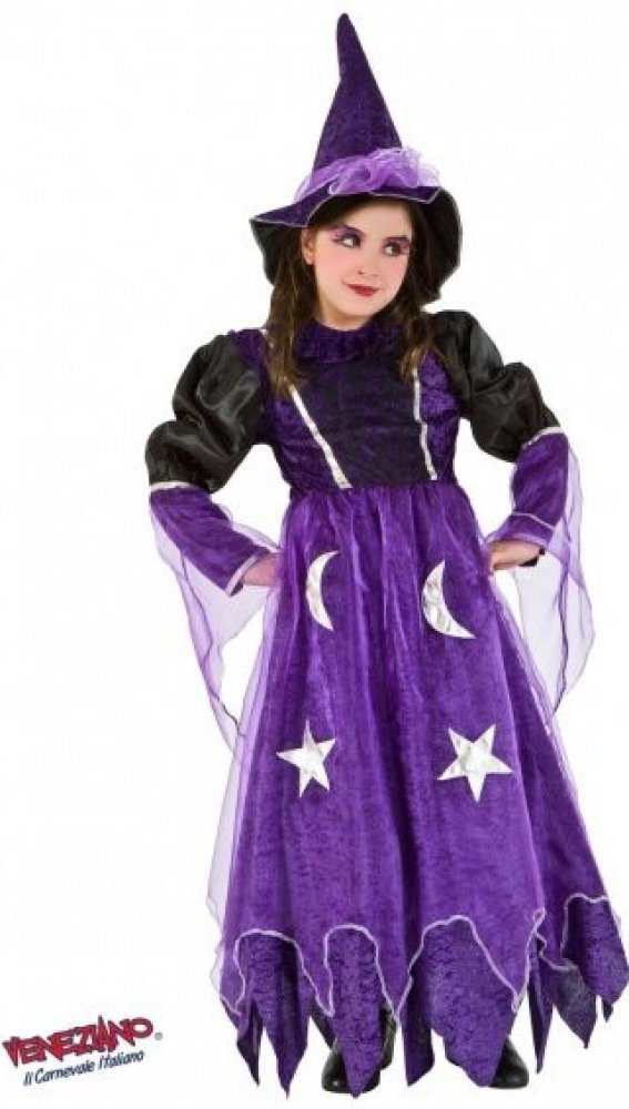 krásný kostým sametové čarodějnice pro děti z dílny benátského výrobce Veneziano. Skvělý halloweenský kostým pro náročné, v dětské velikosti XL. Fialové čarodějnické šaty s černými rukávy, na rukávech fialové závoje a stříbrné nášivky, čarodějnický klobouk.