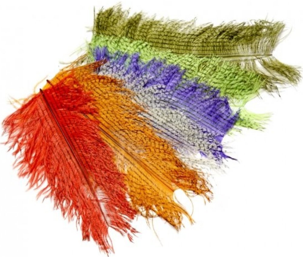 Kus barveného pštrosí peří s krátkými "srpky", které jsou po celé délce barvené do strakaté "grizzly" podoby. Tohoto klasického přírodního materiálu můžete skvěle využít při vázání chlupatých tělíček větších říčních i jezerních nymf či hustých křídel a ocásků menších pstruhových a dravcových streamerů.