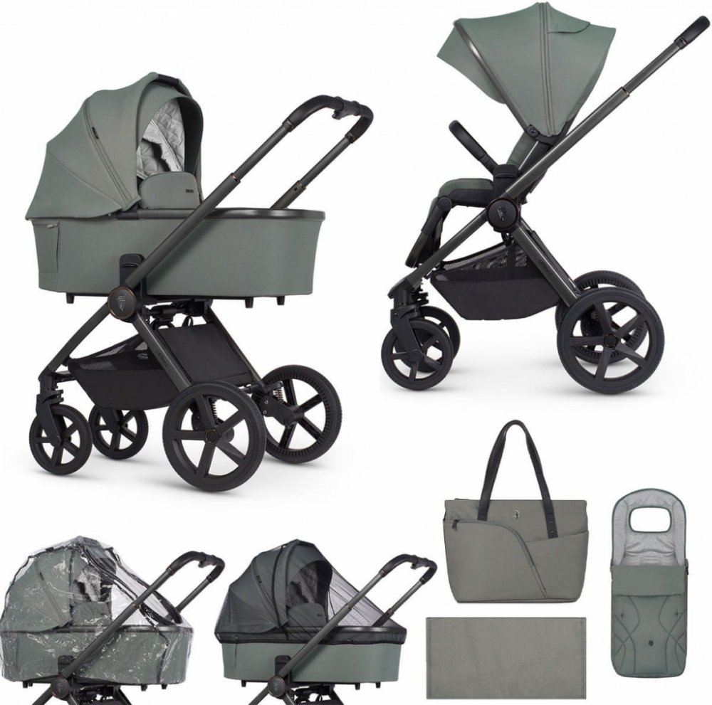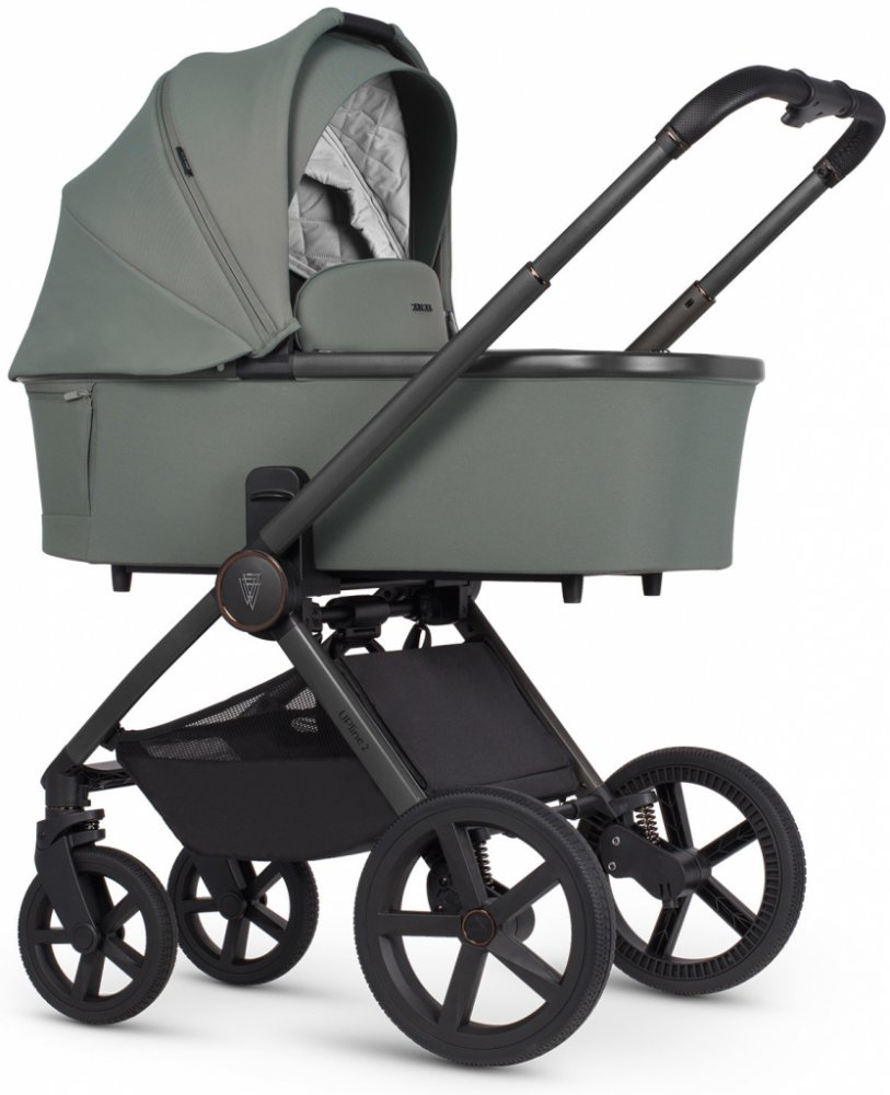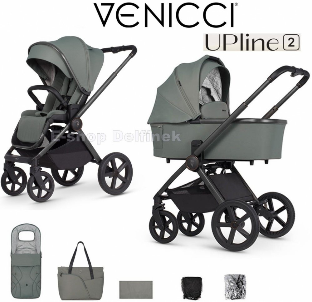 SOUČÁSTI KOČÁRKU VENICCI UPLINE 2 : podvozek, hluboká korba, sportovní nástavba, nánožník na hlubokou korbu i sportovní nástavbu, taška na madlo, moskytiéra, pláštěnka, fusak a košík.