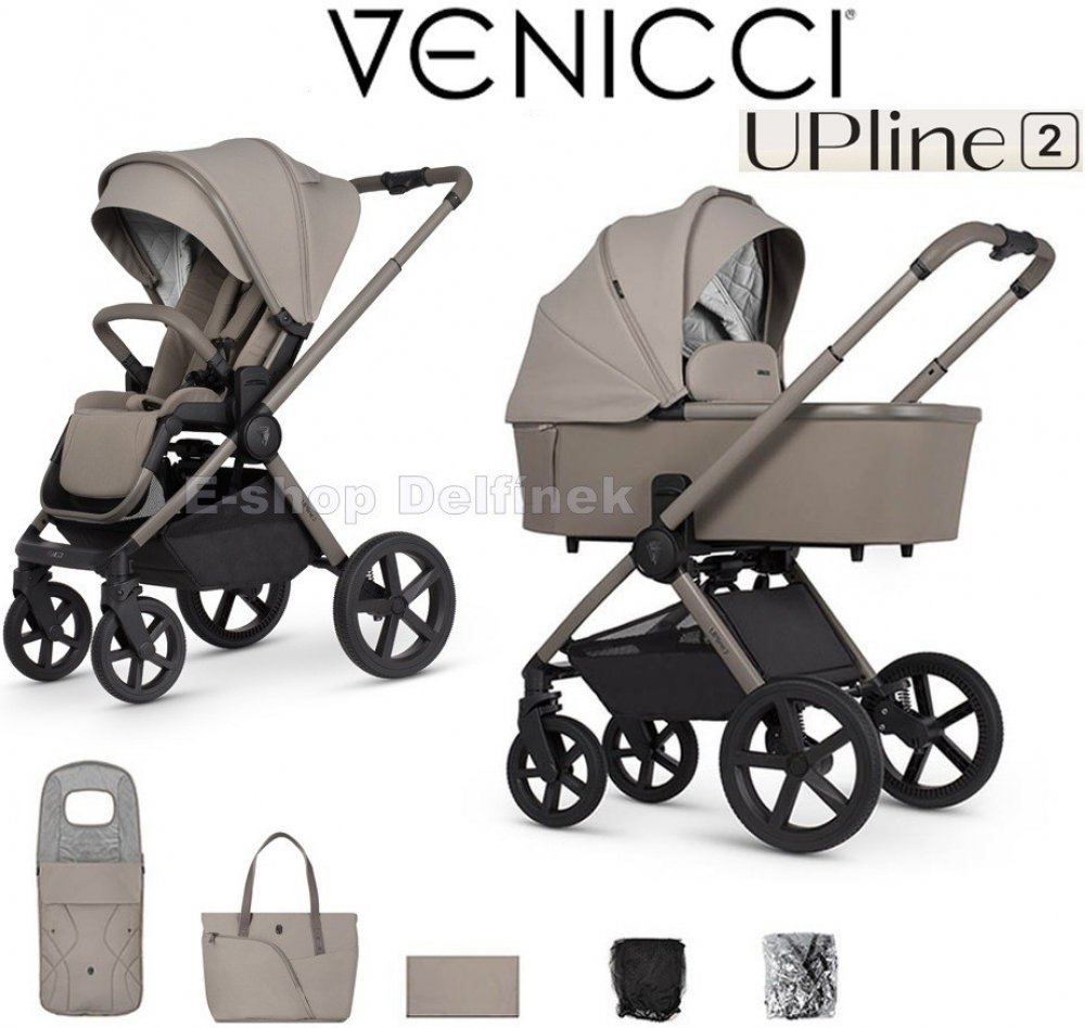 SOUČÁSTI KOČÁRKU VENICCI UPLINE 2 : podvozek, hluboká korba, sportovní nástavba, nánožník na hlubokou korbu i sportovní nástavbu, taška na madlo, moskytiéra, pláštěnka, fusak a košík.
