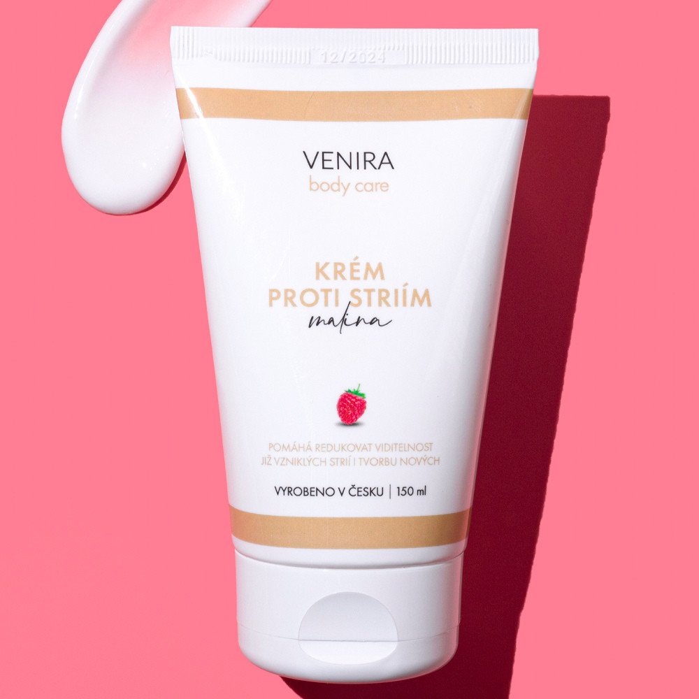Náš VENIRA krém s přírodním složením a sladkou malinovou vůní stimuluje produkci vlastního kolagenu. Právě přílišné namáhání kolagenových vláken je příčinou vzniku strií. Krém tedy řeší problematiku vzniku strií od základů tím, že podporuje oslabenou kůži s povrchovými nerovnostmi, které chybí pružnost. Zároveň průběžně redukuje jemné vrásky uvnitř jednotlivých strií, čímž přispívá k jejich vyhlazení.