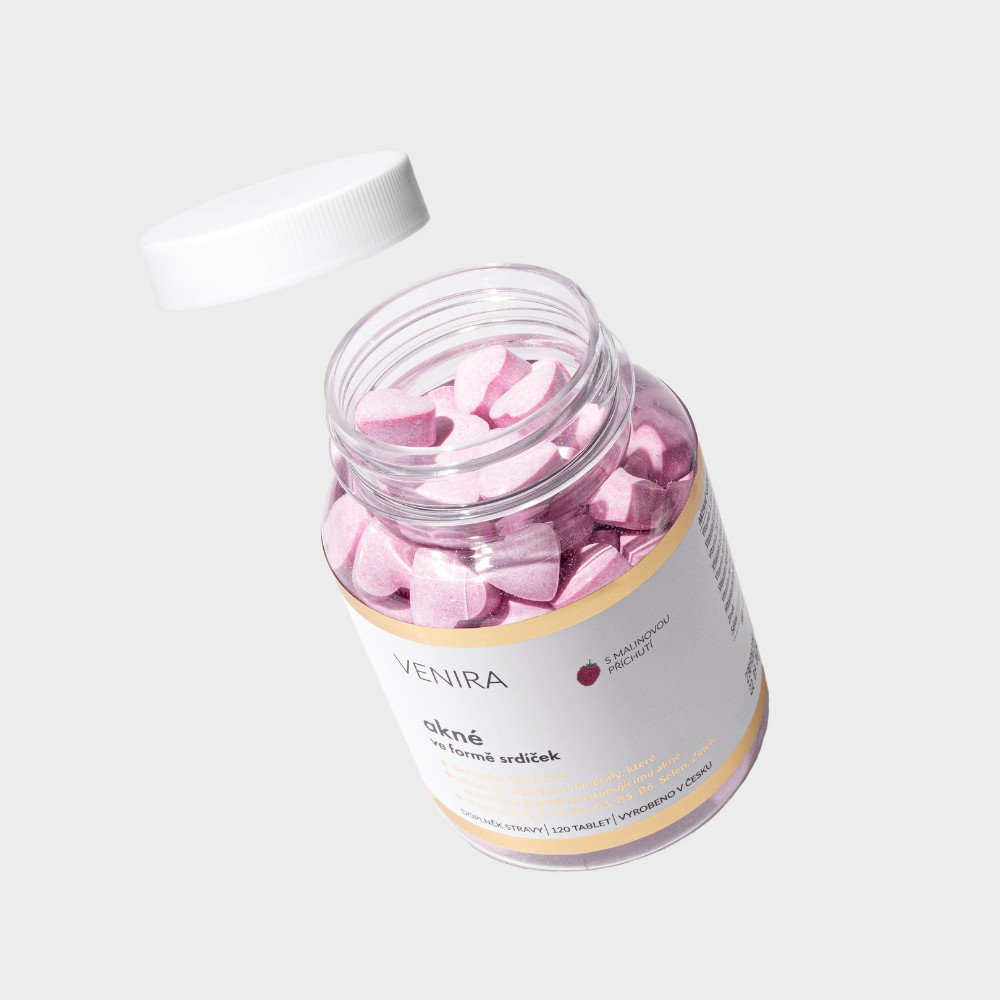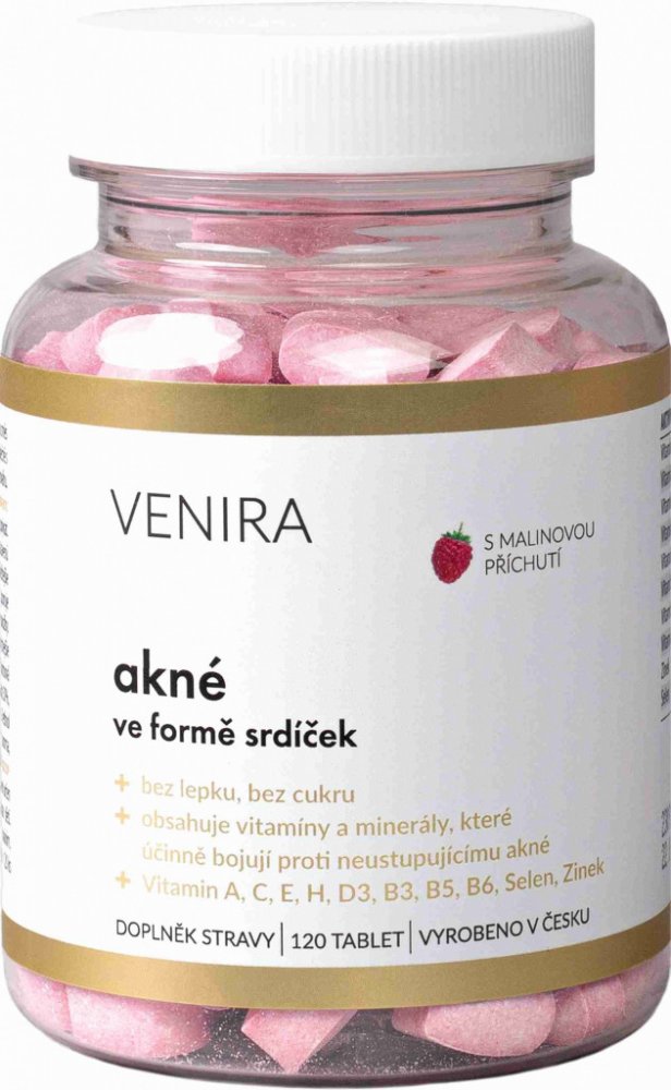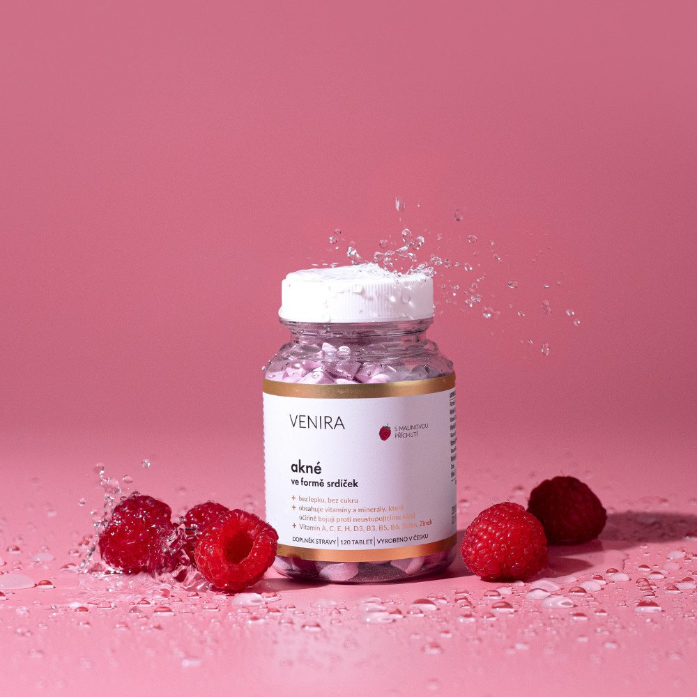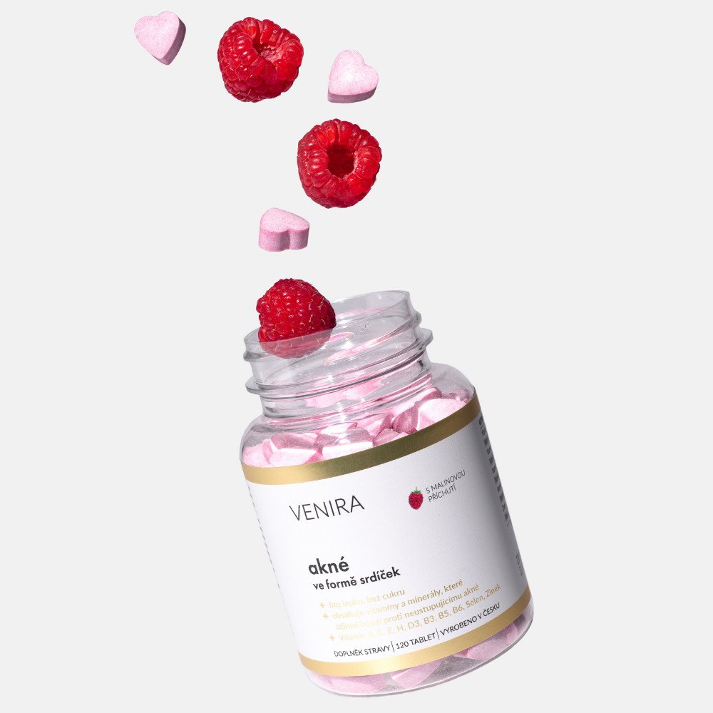 Trápí vás neustupující akné? Bojujte proti němu přírodní silou. VENIRA akné srdíčka zatočí s pupínky raz dva. Navíc mají lahodnou malinovou příchuť, takže se na jejich každodenní užívání budete doslova těšit!