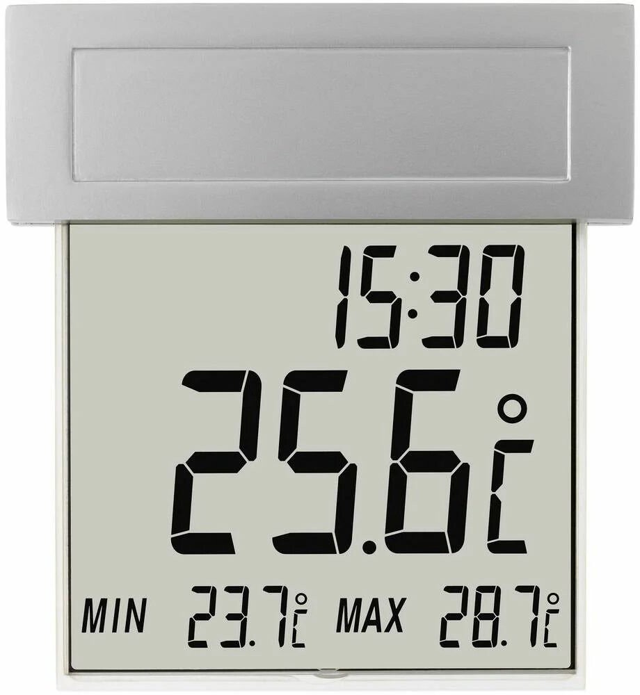 Digitální teploměr na okno TFA 30.1035 VISION SOLAR s velkým a přehledným displejem (97 x 85 mm) se na první pohled odlišuje od ostatních okenních teploměrů solárním panelem, který "ekologicky" dobíjí přiloženou nabíjecí baterii. Teploměr si pamatuje maximální a minimální naměřené hodnoty a automaticky je sám resetuje (max. v 8 hodin ráno a min. v 20 hodin večer). Na přístroji lze přepínat mezi stupni Celsia a stupni Fahrenheit.