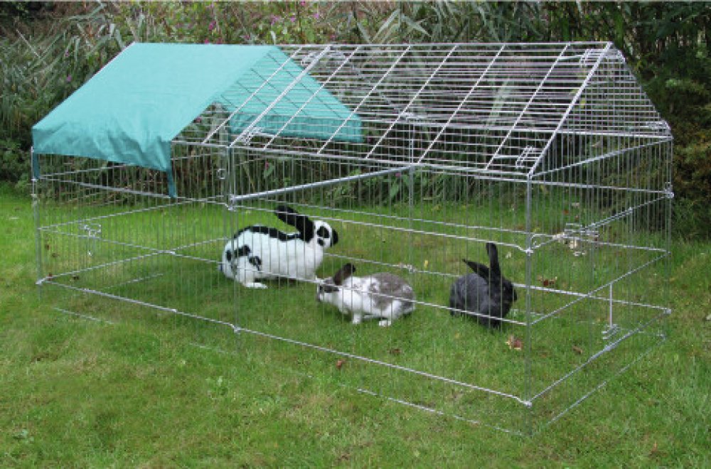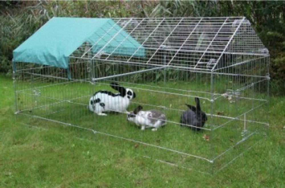 Venkovní drátěný kotec je určen pro králíky a slepice. Má 3 dvířka a sedlovou střechu, snadno se přichytí k zemi. Rozměry jsou: šířka 103cm, výška 103cm a délka 220cm. Dodává se včetně plachty pro částečné zakrytí 1/3 střechy.