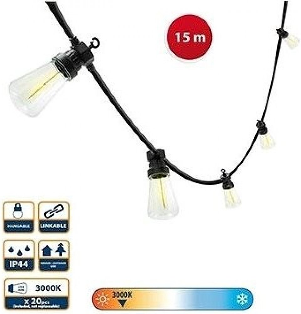 RETRO: Rozšiřitelná světelná girlanda s krytím IP44 15 metrů 20 žárovek LED "Filament" Světelný věnec RETRO obsahuje 20 integrovaných LED žárovek (nevyměnitelných) typu "Filament" v příjemné teplé bílé barvě (3000 K). Skleněné žárovky ve formátu "papaya" (průměr 5 mm) poskytují rozptýlené světlo a mají výkon 0,48 W na žárovku se světelným tokem 55 lumenů každá. Při celkové délce 15 metrů je mezi jednotlivými žárovkami prostor 60 cm. Světelný řetěz lze prodloužit až na 3 stejné girlandy a je vybaven nízkonapěťovým transformátorem. Je vhodný pro vnitřní i venkovní použití (IP44) a je vybaven háčky pro zavěšení každé žárovky. Ideální pro altány, terasy, večírky, svatby, venkovní akce. Vlastnosti: Svítidlo je vhodné pro osvětlování, které se používá v interiérech: ✓ Příjemná teplá bílá 3000 K ✓ Pro venkovní použití (stupeň krytí IP44) ✓ Lze rozšířit až na 3 řetězyTechnické specifikace Výrobce: Velamp Délka: 15 m Stupeň krytí IP: STUPEŇ OCHRANY: IP44 Zdroj světla: světelný zdroj: SVĚTELNÝ ZDROJ: SMD LED Výstup: LED dioda: lED dioda: 9,6 W Světelný tok/LED: světelný tok: 55 lm Průtok: 15 m Barevná teplota: 3000 K Rozměry (balení): rozměry: 250 x 300 x 150 mm Hmotnost: 300 x 300 mm: 1080 g Venkovní světelný řetěz s 20 retro žárovkami vhodný např. pro oslavu na zahradě. Rozšiřitelný 20 integrovaných LED žárovek (nelze vyměnit) teplá barva 3000K Žárovky G50 (průměr 50 mm), rozptýlené světlo. 0,34 W / žárovka, 25 lumenů / žárovka. Délka řetězu 15 metrů. 60 cm mezi každou žárovkou; lze prodloužit až 3 stejné světelné řetězy. Vybaveno nízkonapěťovým transformátorem; vnitřní nebo venkovní použití (IP44). Se závěsným hákem pro každou žárovku. váha 1 kg