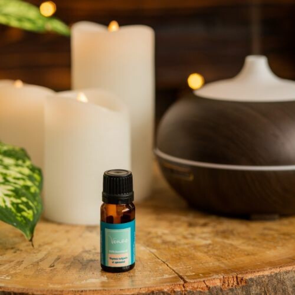 Přidejte několik kapek tymiánového oleje do aromalampy nebo difuzéru, aby se šířila jeho vůně a poskytovala prospěšné účinky pro dýchací systém a celkovou pohodu.