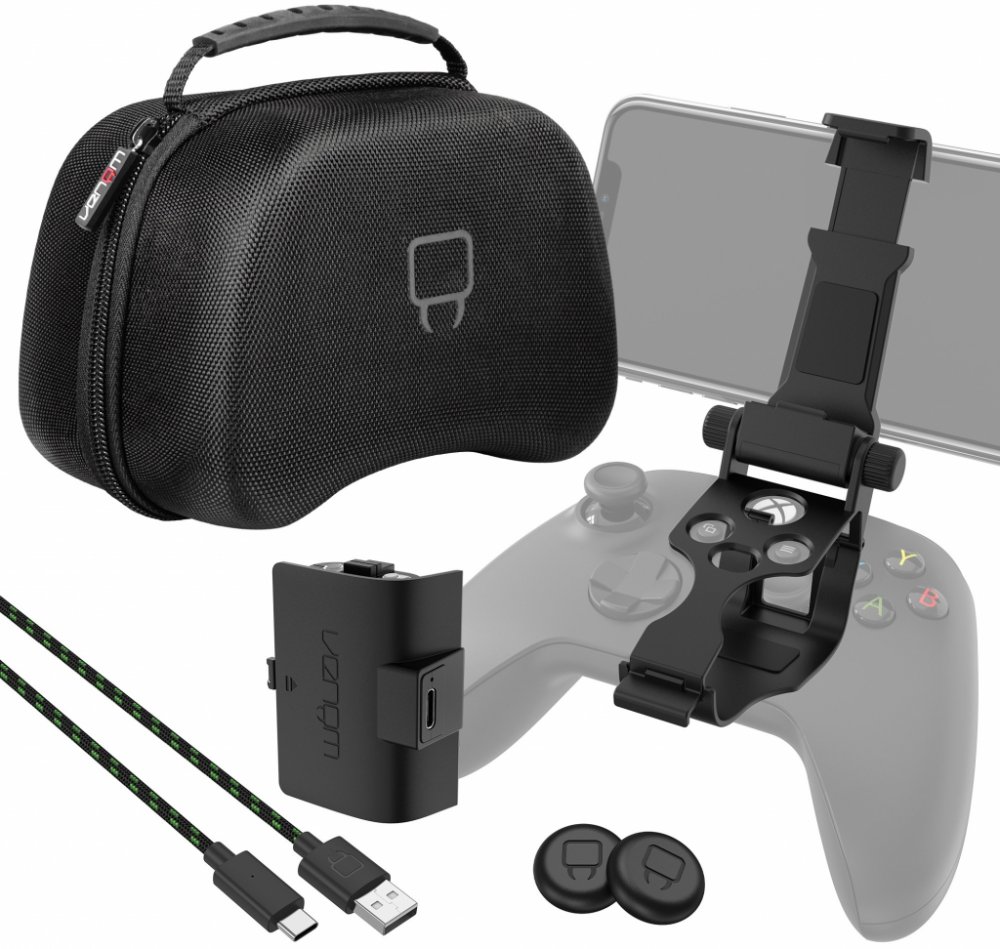 obsahuje cestovní pouzdro, skládací držák na mobilní telefon, dobíjecí baterii, 2m dobíjecí kabel a ochranné opěrky pro páčky ovladače