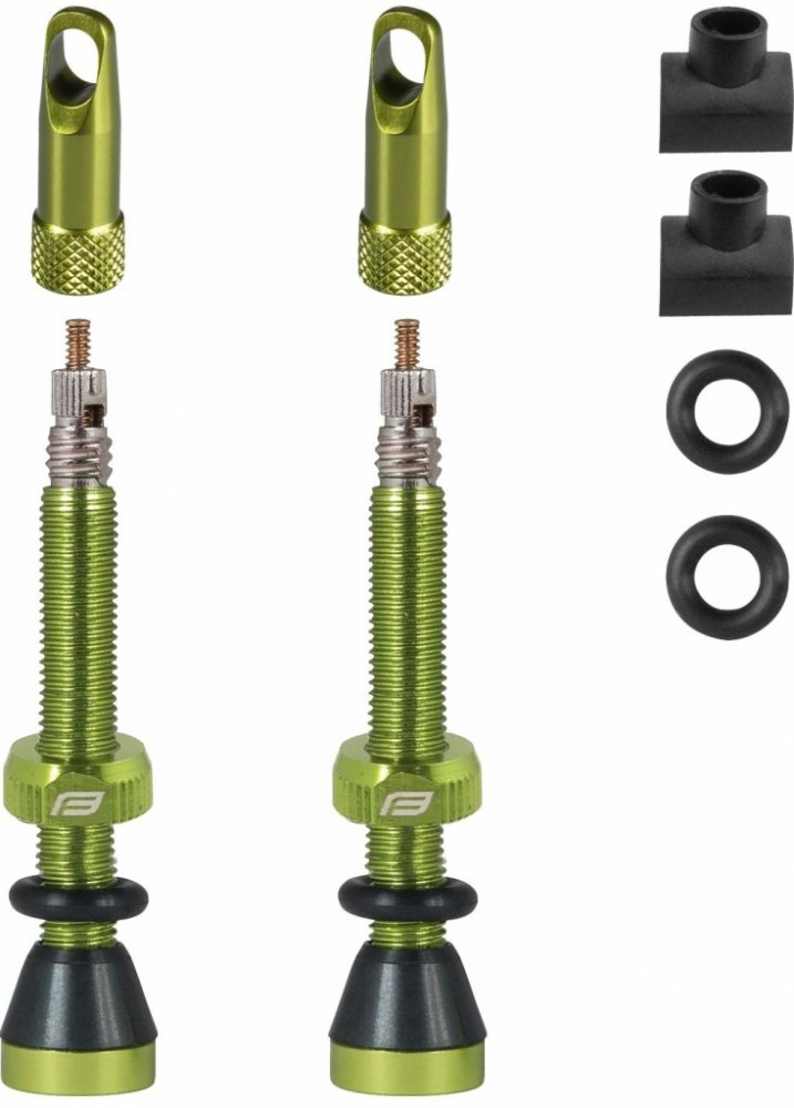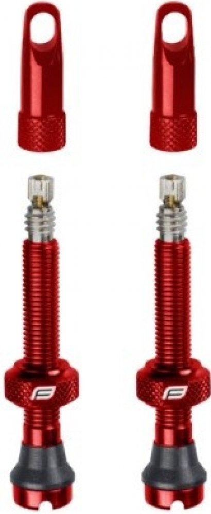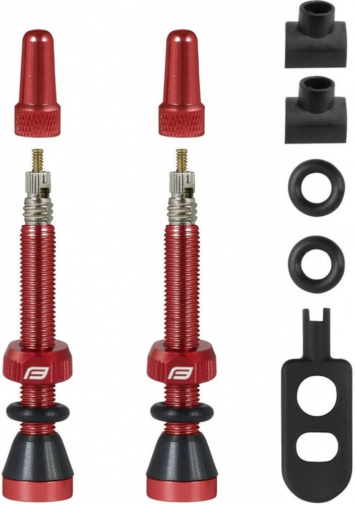 Ventilky FORCE pro bezdušový systém červené Art.Nr. 750443 Sada obsahuje 2 kusy hliníkových galuskových (FV) ventilků s těsnícím kroužkem a ráfkovou matkou Čepička slouží jako klíč na vložku gal. ventilku - 2 ks (náhradní) těsnících kroužků - 2 ks (náhradních) hranatých patek ventilku - délka tubeless ventilku bez vložky je 44 mm - hmotnost 1 kompletního ventilku je 5,9 gr