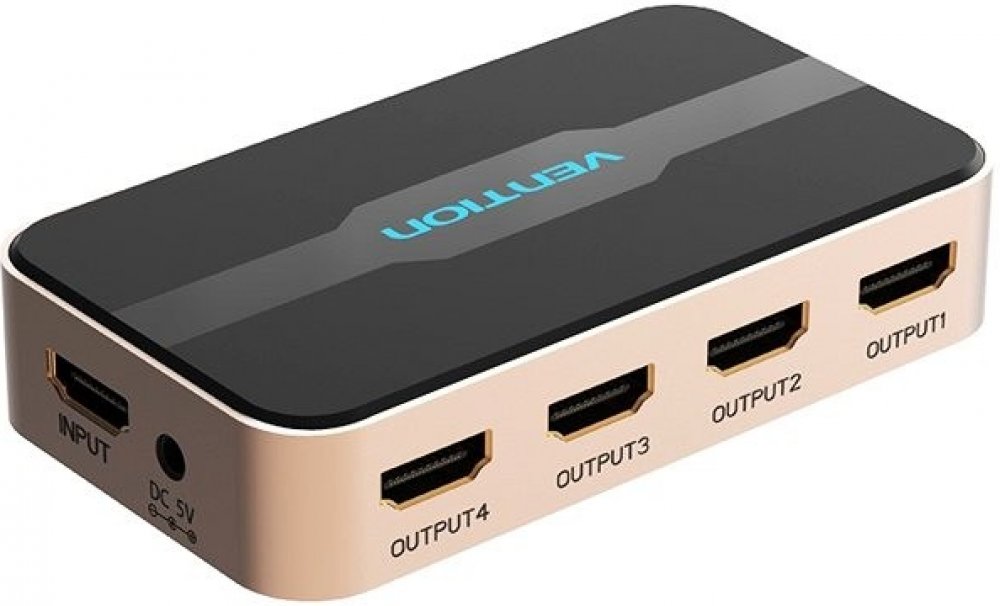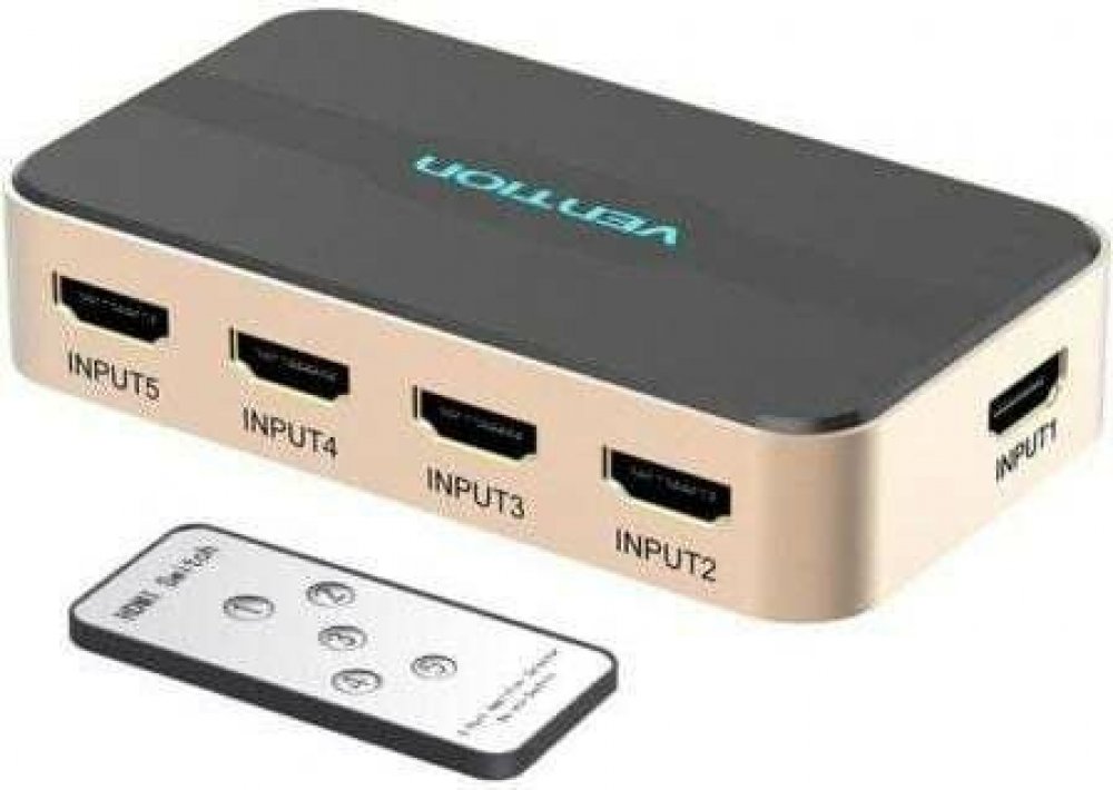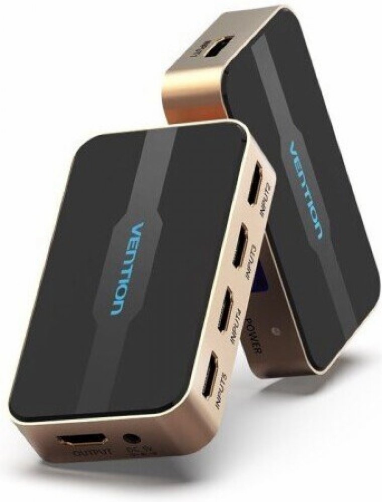 Přepínejte až mezipěti zařízenímiDíky tomuto přepínači značky Vention budete moci k jednomu zobrazovacímu zařízení připojit až pět zdrojů obrazu a libovolně mezi nimi přepínat. Pro snadnější obsluhu je v balení přiložen dálkový ovladač.VERZE HDMI1.4MAX. ROZLIŠENÍ4K@30HzROZMĚRY105 × 59 × 20 mmSpolehlivý a odolnýSwitch Vention oceníte i po stránce provedení. Hliníková konstrukce v kombinaci s odolným ABS plastem, pozlacené konektory či povrchová úprava v černé a zlaté barvě vás osloví hned na první pohled.Dva způsoby ovládáníNechybí ani světelná indikace aktivního zdroje. Přepínat mezi vstupy můžete buď již zmíněným dálkovým ovladačem, případně tlačítkem přímo na zařízení. Switch Vention vyžaduje externí napájení.Klíčové vlastnostiswitche VentionUmožňuje přepínání mezi pěti zdroji obrazuPodpora 4K rozlišení (30 Hz)Přepínání tlačítkem nebo dálkovým ovladačemElegantní provedeníNapájení 5V/1A