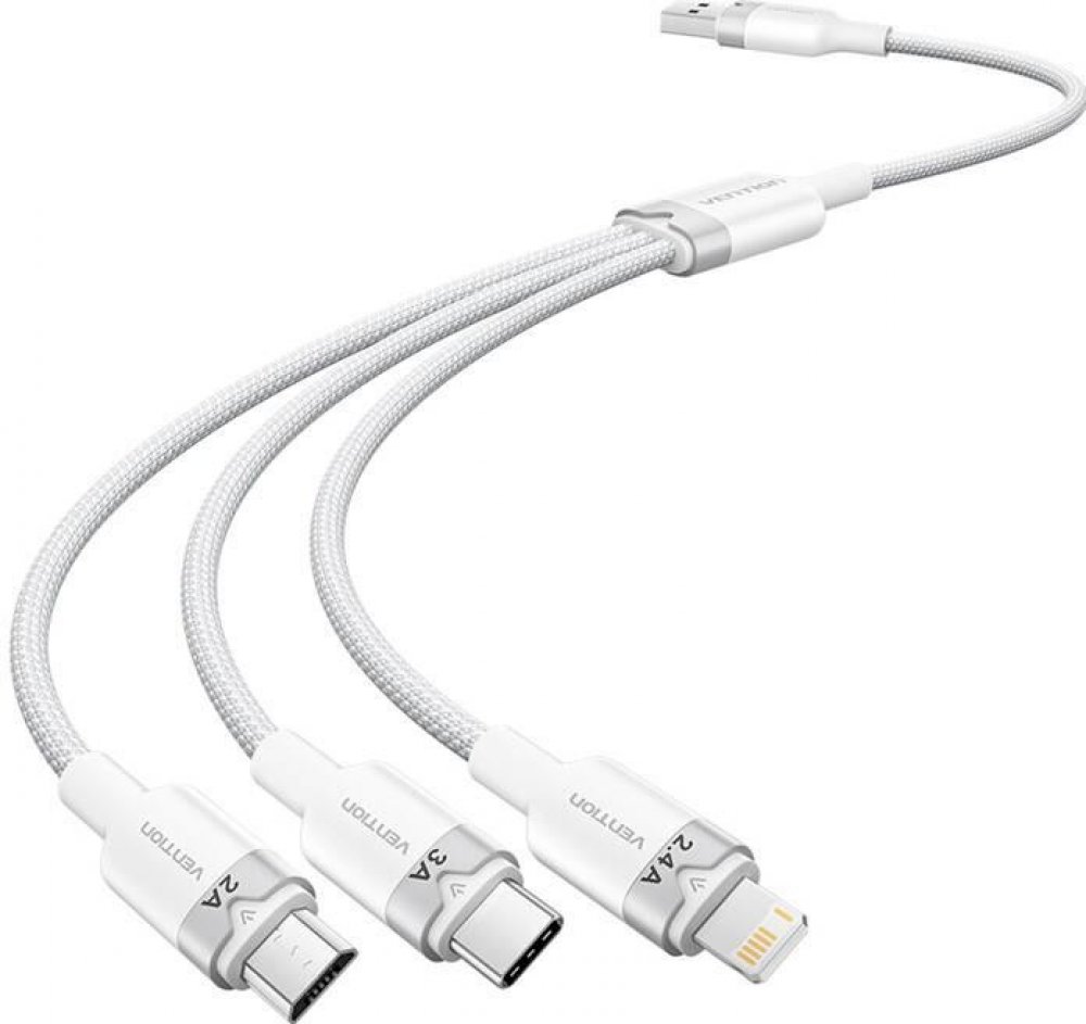Kabel USB 2.0 A na 3v1 3A Vention CTPWG 1,5 m (bílý).Kabel USB 2.0 A na 3v1 3A Vention CTPWG 1,5M je univerzální řešení, které vám umožňuje nabíjet a synchronizovat různá zařízení pomocí jediného kabelu. Je vybaven třemi různými konektory - Lightning, USB-C a Micro-B - a je ideální pro nabíjení moderních smartphonů, stejně jako starších zařízení, jako jsou powerbanky a fotoaparáty.Univerzální komp...