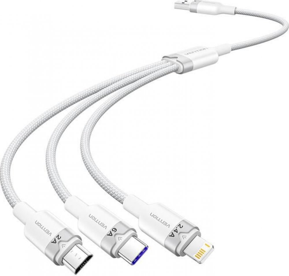 Datový kabel Vention USB 2.0 A Male to 3-in-1 USB-C & Lightning & Micro-B Male 6A CableDatový a nabíjecí kabel Vention je vybaven konektory USB-A na USB–C, Lightning a Micro-B. Využijete jej pro přenos dat a nabíjení všech možných zařízení. Je vhodný pro telefony, tablety i notebooky. Jistě oceníte kvalitní a především odolné zpracování kabelu a rychlý přenos dat až 480 Mbps (přes USB-C konektor)....
