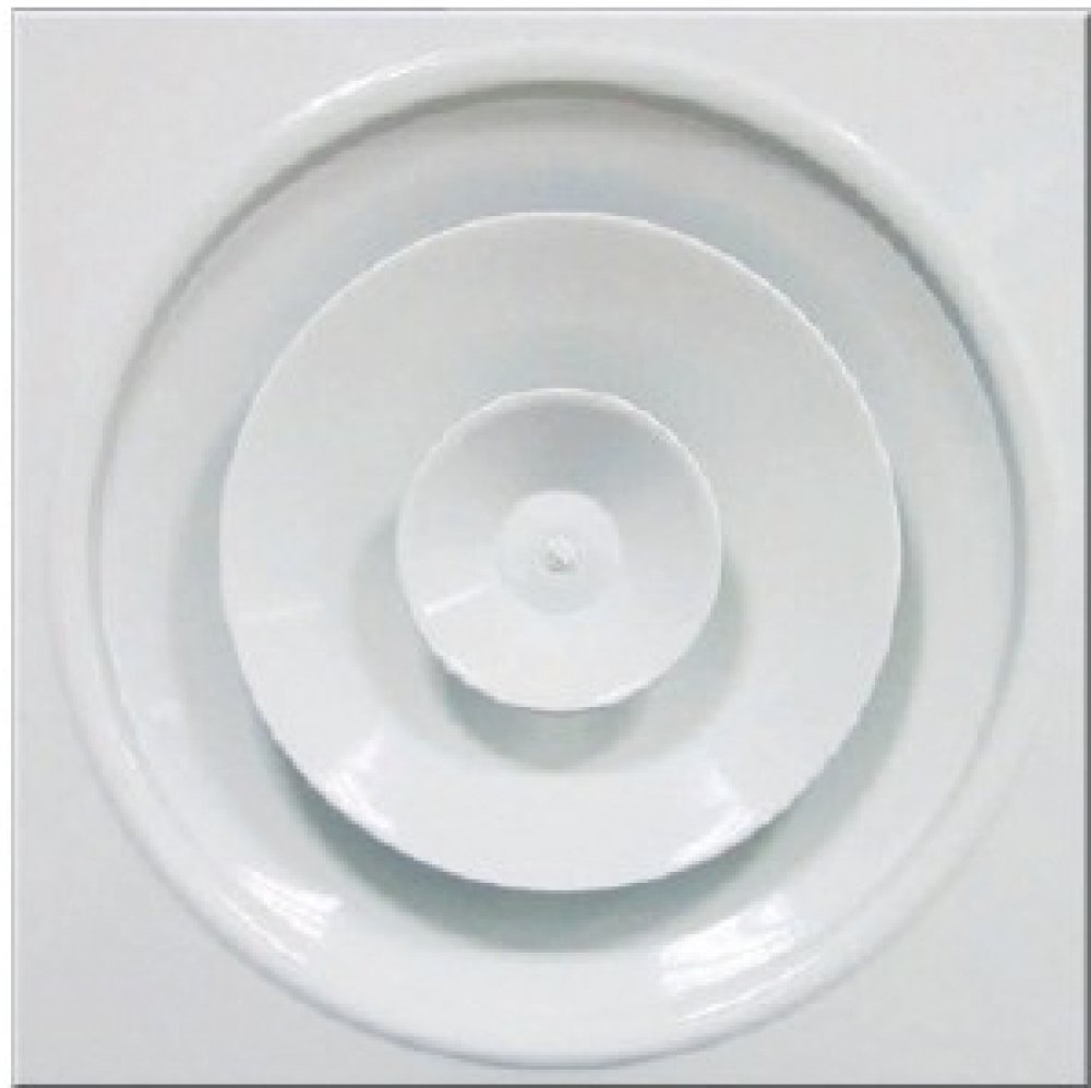 Kruhový anemostat s nastavitelným středovým kuželem. Anemostat lze dodat také v provedení se čtvercovou deskou určenou pro kazetové stropy (typ S).