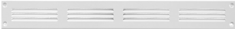 Ventilační mřížka - bez příruby, barva bílá, materiál pozink. ocel, obdélníkový tvar, předpokládané umístění (fasáda, zdivo), elegantní design, síť proti hmyzu, ptactvu, hlodavcům, jednoduchá instalace, montážní otvory, rozměry 400 × 50 mm (Š×V), hmotnost 0,1 kg