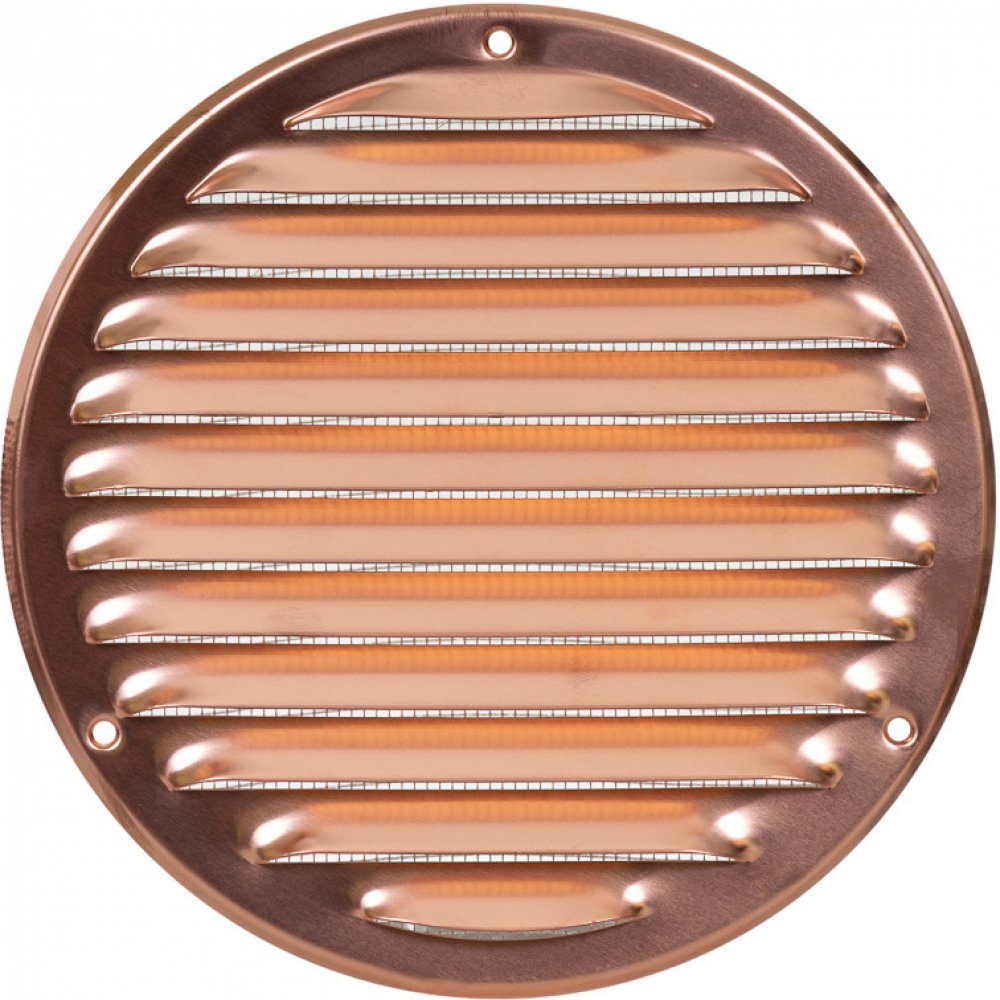 Ventilační mřížka - bez příruby, barva měděná, materiál měď, s pevnou žaluzií, do interiéru i exteriéru, elegantní design, síť proti hmyzu, ptactvu, hlodavcům, jednoduchá instalace, montážní otvory, rozměry 199 × 199 mm (Š×V), hmotnost 0,5 kg