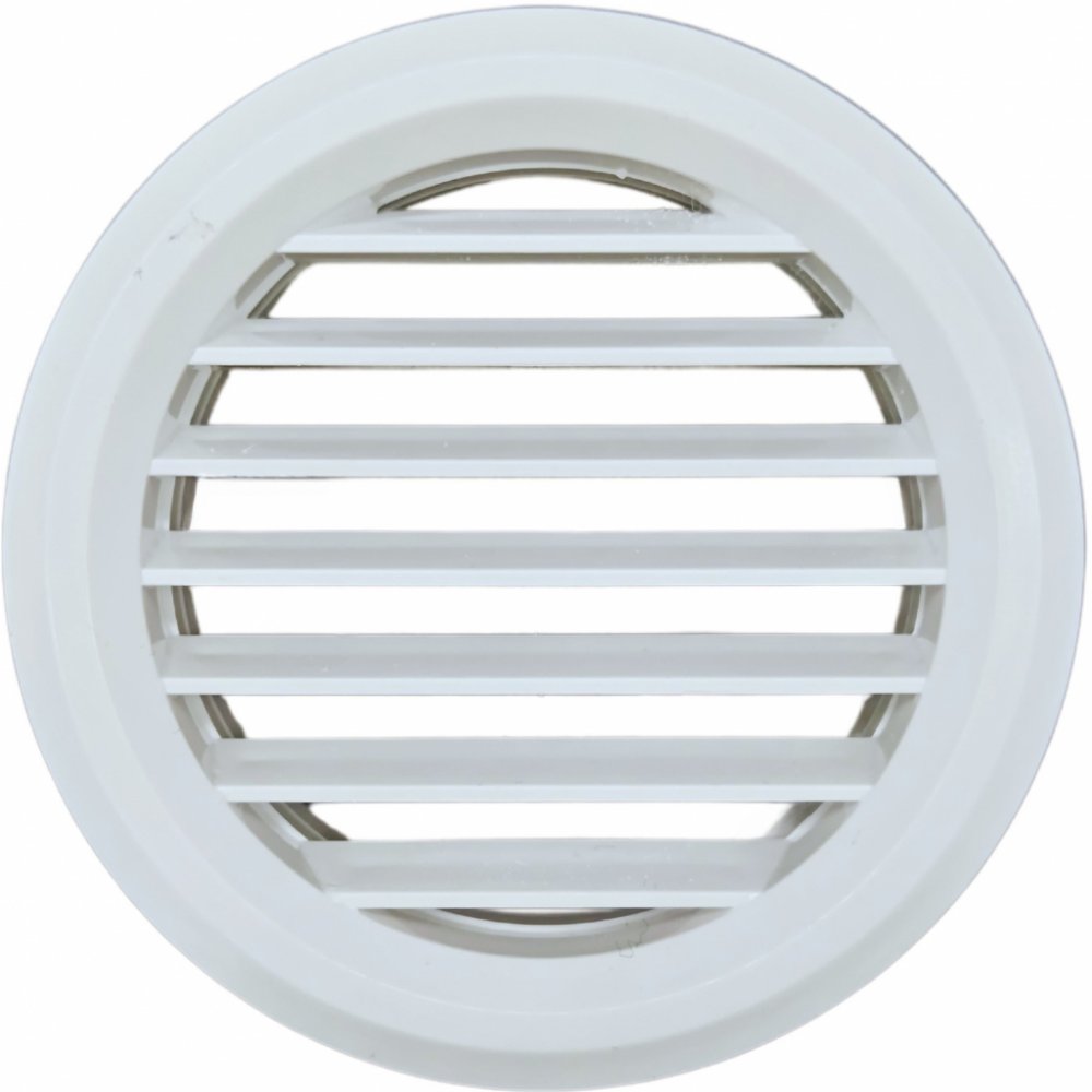 Bílá plastová kruhová odvětrávací mřížka MV 50 bVs se síťkou proti hmyzu. Mřížku je možné vsunout do potrubí a za pomoci lepidla připevnit, nebo přišroubovat ke stěně vruty.