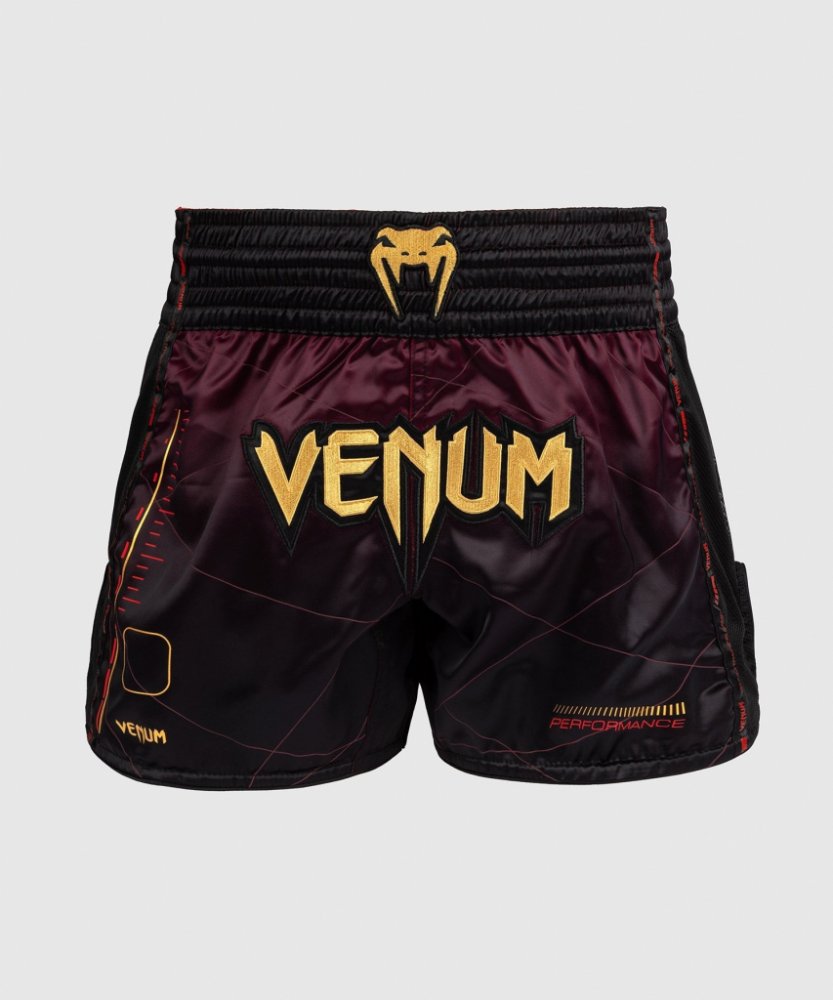 Tyto výrazné muay thai kraťasy byly navrženy s elegantním černým základem zvýrazněným dynamickými barevnými liniemi, které odrážejí žár a energii boje. Loga Venum jsou umístěna na přední straně a na bocích kraťasů a také v pase.