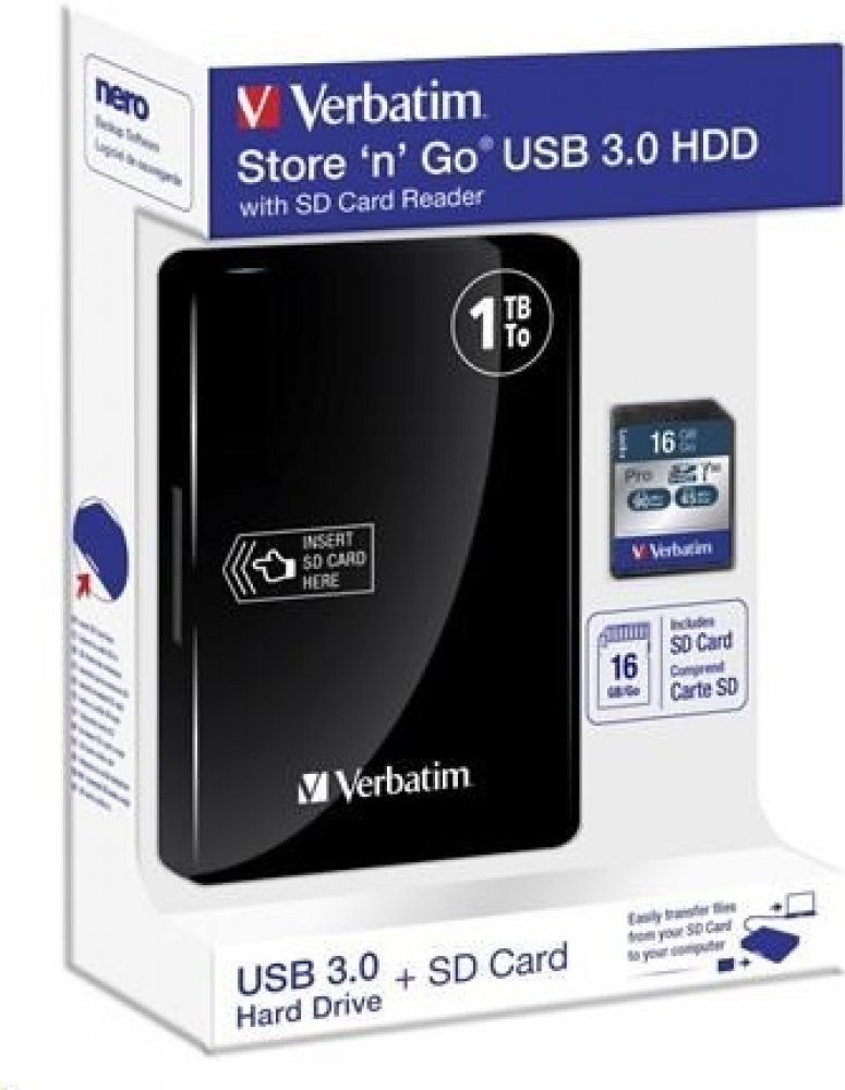 Verbatim pevný disk se čtečkou karet a kapacitou 1TB* Snadný přenos souborů z SD karty na pevný disk či do počítače* Vysokorychlostní velkokapacitní úložiště* Rychlé a bezpečné řešení pro rozšíření úložiště nebo zálohování souborů* USB 3.0 SuperSpeed – pro ultrarychlý přenos dat* USB plug and play (není nutné žádné další napájení)* Software Nero Backup* Softwarový spořič energie* SD karta je plně kompatibilní s fotoaparáty, notebooky a čtečkami karet, které podporují formát SDHC/SDXC.Pevný disk Verbatim Store and Go USB 3.0 se čtečkou SD karet poskytuje rychlé a bezpečné řešení pro rozšíření úložiště a zálohování souborů. Přenosný pevný disk má po straně čtečku SD karet a dodává se s prémiovou paměťovou kartou SDHC Verbatim. Samotný pevný disk obsahuje vysoce výkonné úložiště využívající rozhraní USB 3.0 „Super Speed“. USB 3.0 nabízí až 10krát rychlejší rychlost přenosu dat než USB 2.0 (podle rychlosti sběrnice USB), a nabízí tak ultrarychlý přenos dat na cestách.Ukládejte a přenášejte své digitální a každodenní pracovní soubory na tomto skutečně mobilním disku. Jeho stylový design se pěkně hodí na moderní pracovní stůl jako dokonalý doplněk k notebooku. Po připojení k notebooku se pevný disk a čtečka karet zobrazí pod dvěma samostatnými písmeny jednotek, což umožňuje snadný přenos souborů z SD karty ve čtečce na úložiště v pevném disku nebo notebooku a naopak.Přenosný pevný disk Store n Go používá rozhraní USB 3.0 (jedno rozhraní USB 3.0), je však zpětně kompatibilní s porty USB 2.0 na počítačích a noteboocích. Jednotka nevyžaduje žádné externí napájení. Jednoduše ji připojte a používejte.Jednotky o kapacitě 2 TB nebo méně jsou naformátovány ve formátu FAT32, což umožňuje jejich okamžité použití v systémech Windows a Mac OSx. Jednotky o kapacitě nad 2 TB jsou naformátovány ve formátu NTFS, který je kompatibilní se systémem Windows, ale pro plnou kompatibilitu se systémy Mac OSx je nutné jednotku přeformátovat na formát HFS+. Formátování na HFS+ je možné provést nástrojem Verbatim VHD Formatter, který je uložen na jednotce.Chcete-li lepší zabezpečení, máte k dispozici software Nero BackItUp Essentials, který umožňuje zálohovat pevný disk vašeho notebooku nebo počítače PC. Software BackItUp Essentials umožňuje zálohovat všechny vaše soubory, složky a disky, kdykoli to potřebujete. Případně v něm můžete naplánovat automatické zálohování v požadovaný čas a zlepšit tak své zabezpečení.Software Nero BackItUp Essentials je kompatibilní se systémy Windows 7, Windows 8 a Windows 10 (není kompatibilní se systémem Mac OS).Přenosné pevné disky Verbatim Store and Go jsou vybaveny softwarem pro úsporu energie Green Button. Software Green Button zastaví otáčení pevného disku, pokud není používán, čímž zvyšuje efektivitu a šetří energii.Dostupné jsou 3 možnosti úsporného režimu. Přechod do úsporného režimu po 10 minutách nebo v krocích po 10 minutách až do 120 minut. Do úsporného režimu je rovněž možno přejít poklepáním na ikonu Green Button na ploše nebo je možno přechod do úsporného režimu zakázat.Omezená dvouletá záruka VerbatimKapacita:Pevný disk: 1 TBPaměťová karta: 16 GB