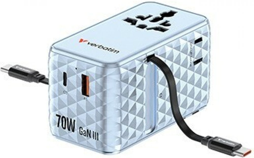Buďte připraveni na cesty s jedním univerzálním adaptérem, který kombinuje nejnovější technologii, globální kompatibilitu a rychlé nabíjení.Pokročilá technologie GaN III – Univerzální cestovní adaptér Verbatim využívá nejmodernější technologii GaN III, špičkový polovodičový materiál, který efektivně zvládá vysoké napětí a vysokofrekvenční aplikace. Díky tomu je adaptér menší, lehčí a účinnější než tradiční produkty založené na křemíku.Globální kompatibilita – Připojte se snadno ve více než 180 zemích. Tento univerzální cestovní adaptér vám zajistí přístup k elektrické síti po celém světě. Ideální pro nabíjení notebooků, chytrých telefonů, Bluetooth reproduktorů, tabletů, powerbank a dalších zařízení. Stačí vysunout tři nejběžnější mezinárodní zástrčky – EU, UK a US – a otočit kolíky pro použití v Austrálii nebo Číně.Integrované duální zasouvací USB-C kabely – Zapomeňte na nošení dalších kabelů. Adaptér je vybaven dvěma zasouvacími USB-C kabely, kompatibilními s většinou zařízení s USB-C konektorem, takže budete mít vždy vše po ruce.Superrychlé 6v1 nabíjení až do 70 W – Nabíjejte až šest zařízení současně s univerzálním cestovním adaptérem Verbatim GaN III. Disponuje AC síťovou zásuvkou, zásuvkou USA/JP, USB-C portem, USB-A portem a dvěma zasouvacími USB-C kabely s celkovým výkonem až 70 W. USB-C PD 3.0 a QC 4+ podporují nabíjení až do 70 W, zatímco USB-A QC 4+ až do 60 W.Stylový, kompaktní a bezpečný – V elegantním černém 3D diamantovém designu, vyrobený z vysoce kvalitního nehořlavého polykarbonátu a certifikovaný dle CE, UKCA, FCC a ROHS. Obsahuje pojistku BS1362 10 A (včetně náhradní) a cestovní pouzdro, které vám dodají klid a jistotu na každé cestě.