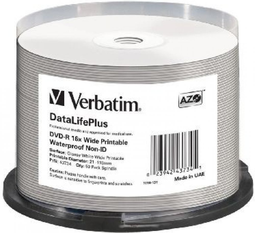 DVD-R 16x Wide Printable Waterproof No ID Brand Disky Verbatim DVDR/RW využívají technologii MKM/Verbatim, která zajišťuje, že každá nahrávka bude v té nejvyšší kvalitě. Díky vývojovému středisku společnosti Mitsubishi Chemical a silné spolupráci s výrobci jednotek je zajištěna široká kompatibilita disků Verbatim, které tak jsou ideálním řešením pro sdílení počítačových dat, domácích videí, fotografií a hudby. Od evropské jedničky* v oblasti zapisovatelných médií * SCCG CD/DVDR 03 - 09. Profesionální optická média Verbatim splňují přísnější specifikace, než jsou standardy jejich patřičných subjektů. Přísnější specifikace zajišťují vyšší kompatibilitu se zapisovacími a přehrávacími jednotkami. To má za následek vyšší kvalitu přehrávání, tedy i delší dobu archivace a lepší čitelnost. Profesionální optická média Verbatim rozpoznáte podle značky DataLifePlus. Disk DVD-R je zapisovatelný disk, který poskytuje kapacitu 4,7 GB. Je v souladu se specifikacemi DVD-Forum. Zapisovací vrstva AZO, nejvyšší stabilita zápisu, vynikající životnost. Široký, bílý, lesklý, vodě odolný, inkoustem po-tisknutelný disk má bílý povrch, na který je možno tisknout, až k náboji a po-tisknutelný průměr 21-118 mm. Má vodě odolný povrch a lesklou povrchovou úpravou. Specifikace: Číslo součásti: 43734 Kapacita: 4.7GB Max. zapis. rychlost: 16x Baleni: 50 Pack Spindle Povrch: Se širokou lesklou vodě vzdornou plochou pro potisk inkoustem Oblast tisku: 21-118mm