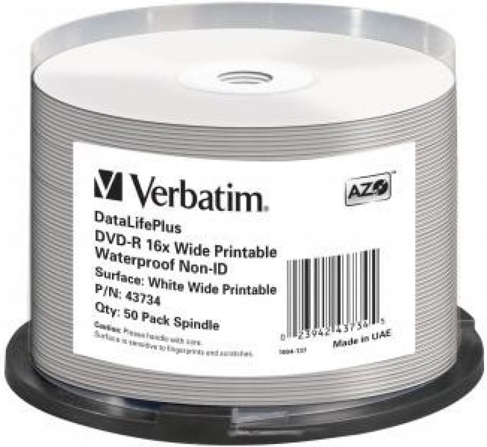 DVD-R 16x Wide Printable Waterproof No ID Brand Disky Verbatim DVDR/RW využívají technologii MKM/Verbatim, která zajišťuje, že každá nahrávka bude v té nejvyšší kvalitě. Díky vývojovému středisku společnosti Mitsubishi Chemical a silné spolupráci s výrobci jednotek je zajištěna široká kompatibilita disků Verbatim, které tak jsou ideálním řešením pro sdílení počítačových dat, domácích videí, fotogr...