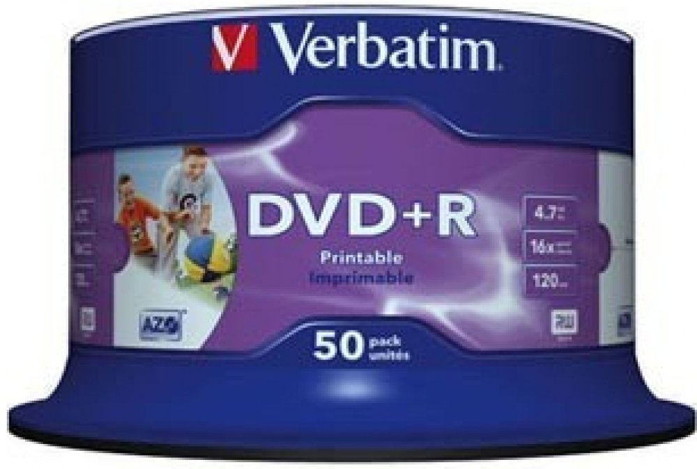 Kvalitní Verbatim 43512 DVD+R Wide Inkjet Printable, 50-pack Spindle, 4.7GB, 16x, 12cm, s možností potisku za 441 Kč.