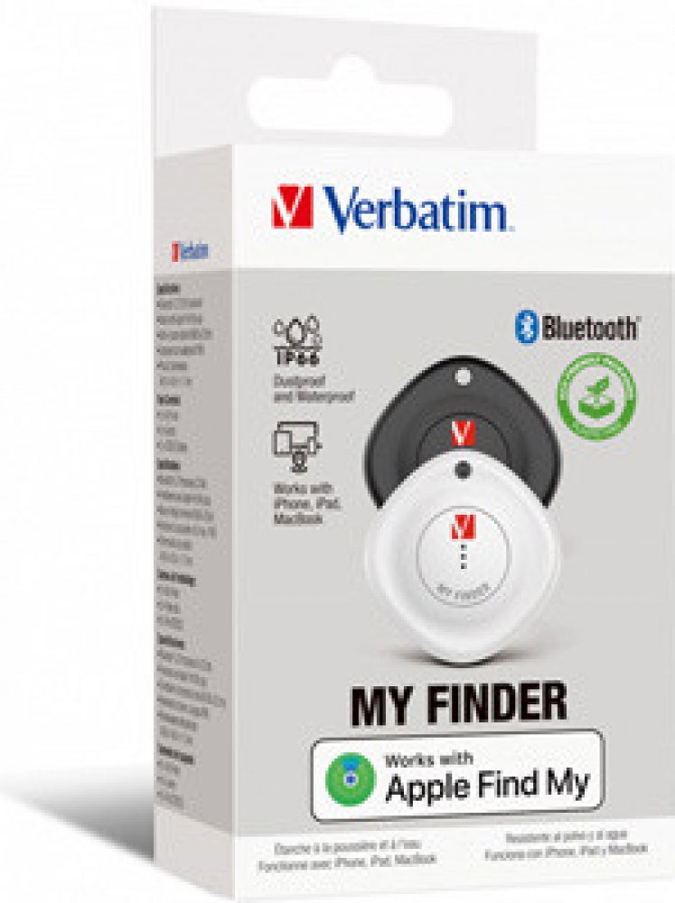 My Finder Bluetooth – balení dvou kusůSledujte své cenné předměty s trackerem My Finder Bluetooth od společnosti Verbatim.My Finder od společnosti Verbatim je sledovací zařízení, které funguje výhradně s aplikací Find My od Apple. Stačí je připevnit na jakýkoliv předmět, který potřebujete sledovat, a pak můžete sledovat jeho polohu v aplikaci Find My na svém iPhonu, iPadu i MacBooku.S trackerem Verbatim My Finder, jenž pracuje s technologií Bluetooth, se vám už nikdy nestane, že byste někam zašantročili své klíče, tašku či jiné cennosti. Jednoduše připevníte toto univerzální zařízení na jakýkoliv předmět, o němž chcete mít přehled, a pokud jej ztratíte, v aplikaci Find My od Apple zjistíte, kde se nachází.A pokud jej najde někdo, kdo je zapojen do sítě Find My od Apple, v režimu Lost Mode této aplikace pro něj můžete zadat své kontaktní údaje.Najděte ztracené věci po zvuku nebo v mapěDíky ekosystému aplikace Find My od Apple můžete snadno zjistit, kde se nachází nějaká vaše věc. Pokud leží někde ve vaší blízkosti, v aplikaci zvolte možnost „Play Sound“ (Přehrát zvuk) a následujte pípání tak dlouho, až ji najdete. Eventuálně můžete také v aplikaci zvolit předmět, který postrádáte, a lokalizovat ho v mapě. Celý proces je anonymní a šifrovaný za účelem ochrany vašeho soukromí.Dlouhá životnost baterieZařízení napájí lithiová baterie, která vám poskytne více než 12 měsíců provozu. Odpadá tak častá výměna baterie. Díky stupni krytí IP66 je zařízení My Finder odolné proti vodě a pronikání prachu, což zajišťuje jeho odolnost.Chytrá upozorněníS chytrými upozorněními nastavenými již z výroby obdržíte do telefonu upozornění, pokud se zařízení My Finder dostane mimo dosah signálu Bluetooth. Připevněte My Finder na svou brašnu nebo batoh na notebook nebo jej zastrčte do peněženky, abyste už nikdy bez nich nevyšli z domu.Své klíče, batoh ani zavazadlo již nikdy neztratíte!Podrobnosti o produktu:Funguje s aplikací Find My od Apple.Připevněte sledovací zařízení My Finder na své osobní věci a jednoduše sledujte, kde se nacházejí.Zařízení vydává zvuky, které vás navedou na místo, kde přesně se věc nachází.S ochranou IP66, která zaručuje voděodolnost a prachuvzdornost.Zvýšená ochrana soukromí díky šifrování dat a skutečnosti, že na zařízení nejsou uložené žádné údaje.Technologie NFC vám dává možnost odeslat své kontaktní údaje nálezci zařízení, které jste ztratili.Až dvanáctiměsíční životnost baterie, která eliminuje nutnost pravidelné výměny.Požadavky na systém:Apple iOSTechnické údaje:Připojení: Bluetooth 5.2, 32bitový procesorAlarm: Vestavěný bzučák (60 dB v cca 25 cm)Baterie: Uživatelsky vyměnitelná baterie model CR2032Ochrana proti vodě a prachu: IP66Rozměry produktu: 40,8 × 40,8 × 11,7 mm (D × Š × H)Hmotnost produktu: 10 gramů (cca)Provozní teplota: 5 °C až 50 °CNeprovozní teplota: -45 °C až 70 °CProvozní vlhkost: 5 % až ~90 % (bez kondenzace)Obsah balení:Tracker My Finder včetně kroužku na klíče a baterie CR2032