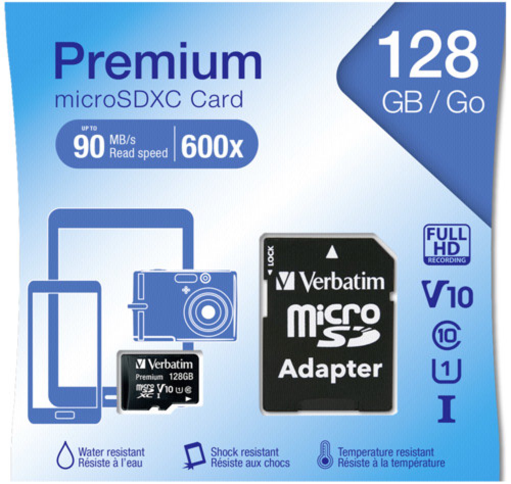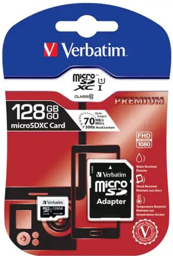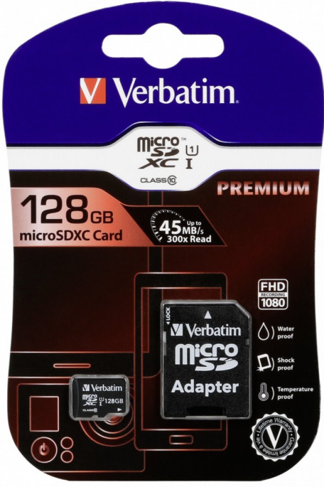 Verbatim Premium U1 Micro SDHC/SDXC Cards Verbatim Premium microSD memory cards expand the onboard memory of your mobile devices, such as smart phones and tablets. With capacities up to 128GB you can capture more high quality photos and full HD videos, carry more files, and enjoy your favourite music wherever you are. Compatible with any device with an SDHC/SDXC* memory card slot Verbatim Premium microSD memory Cards are waterproof & shockproof. Read Speed: 8GB up to 30MB/Sec.** 16GB+ up to 45MB/Sec** Write Speed: Min. 10MB/Sec Suitable for 1080p video capture *SDXC compatible host device required **UHS-1 compatible device required, actual performance may vary depending on host device, interface & usage conditions Product Dimensions: 11mm x 15mm x 1.0mm (L x W x H) (microSD only) Product weight: 0.2 grams (microSD only); 1.6 grams (microSD+ adapter) Capacity: 128GB.