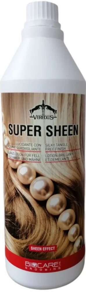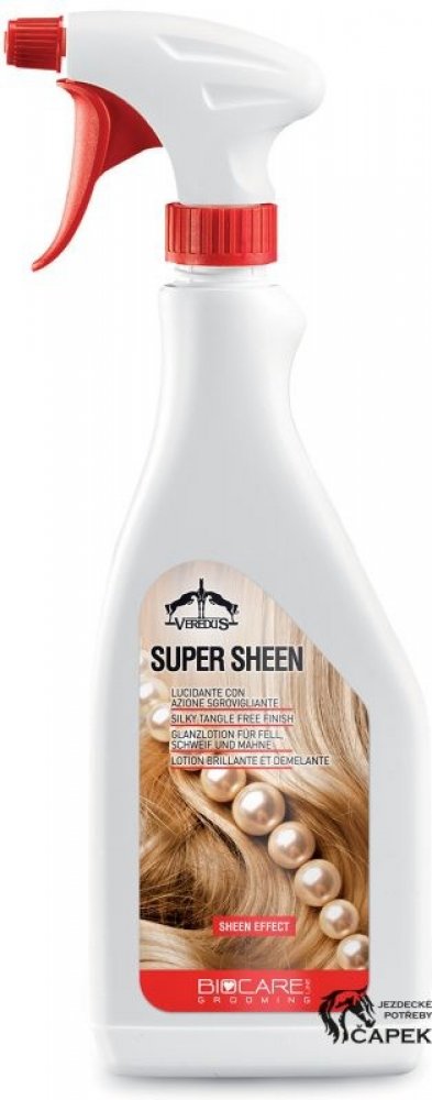 rozčesávající přípravek s hedvábným leskem VEREDUS SUPER SHEEN dodává srsti a žíním hřívy a ocasu jas a lesk vytvoření ochranného filmu dodává koňským žíním a srsti odolnost vůči vodě a odpuzuje prach