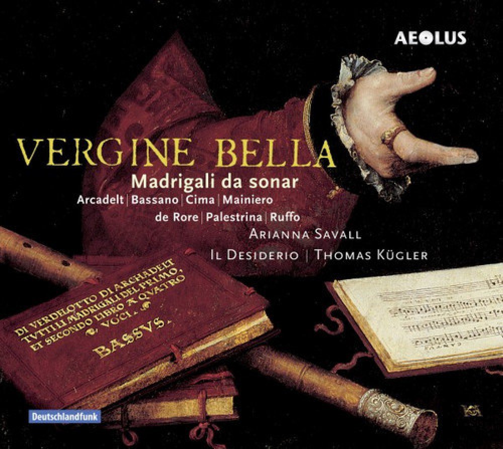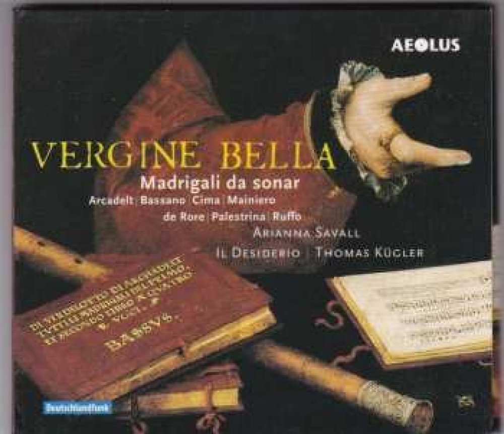 Vergine bellaMadrigali da sonar Arianna Savall (Soprano)Il Desiderio (Traverse flute ensemble)Thomas Kügler (Traverse flute)Ildikó Kertész (Traverse flute)Marcello Gatti (Traverse flute)Ursula Thelen (Traverse flute)Sarah van Cornewal (Traverse flute)Frauke Hess (Bass viol)Frauke Hess (Lirone)Marie Bournisien (Harp)André Henrich (Lute) Vestiva i colli Giovanni Pierluigi da Palestrina (c.1525-1594)Vestiva i colli Bartolomé de Selma y Salaverde (c.1580-c.1638)Non è ch'il duol mi scemi Giovanni Bassano (c.1558-1617)Dormendo un giorno Vincenzo Ruffo (c.1508-1587)O felici occhi miei Vincenzo Ruffo (c.1508-1587)O felici occhi miei Jacques Arcadelt (1505-1568)O felici occhi miei Diego Ortiz (c.1510-c.1570)Io son ferito Giovanni Pierluigi da Palestrina (c.1525-1594)El pietoso Vincenzo Ruffo (c.1508-1587)El travagliato Vincenzo Ruffo (c.1508-1587)Pass'e mezzo antico Giorgio Mainiero (c.1535-1582)Saltarello Giorgio Mainiero (c.1535-1582)Anchor che col partire Girolamo dalla CasaAnchor che col partire Richardo RognionoRicercata prima Giovanni Bassano (c.1558-1617)Anchor che col partire Cipriano de Rore (c.1515-1565)Sonata per Cornetto over Violino in d Giovanni Paolo Cima (1570-1622)Vergine bella Cipriano de Rore (c.1515-1565)Vergine bella Vincenzo Ruffo (c.1508-1587)
