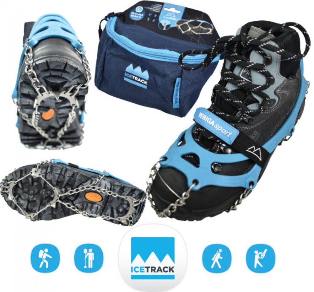 Vyšší řada protiskluzových nesmeků pro náročnější uživatele s odolnějšími prvky v podobě řetězů a devíti ostrých protiskluzových bodců. | Hledáte spolehlivého parťáka pro zimní běh, horskou turistiku nebo extrémní závody typu LH 24? Nesmeky Veriga Ice Track jsou navrženy pro náročné uživatele, kteří se nespokojí s levnými náhražkami. Díky kombinaci špičkových materiálů a precizního evropského zpracování vám zajistí maximální stabilitu na zasněžených, kluzkých i zledovatělých cestách.Špičkové technologie pro váš bezpečný krokMaximální trakce: 9 ostrých protiskluzových hrotů s tepelně zpracovaným povrchem zaručuje extrémní odolnost a nekompromisní zakousnutí do podkladu.Nerezová ocel vysoké kvality: Použité řetězy mají optimalizovaný koeficient kroucení. To nejen zvyšuje přilnavost, ale také dramaticky snižuje riziko přetržení při vysokém zatížení.Prémiová silikonová složka: Na rozdíl od běžných nesmeků obsahuje pružná část speciální silikon. Ten zůstává elastický i v extrémních mrazech, nepraská a výrazně prodlužuje životnost celého produktu.Komfort a praktičnost v terénuNasazení nesmeků je otázkou několika vteřin – stačí je natáhnout přes podrážku a zajistit páskem na suchý zip. Na botě drží pevně, nepovolují se a díky diskrétnímu modrému designu nepůsobí rušivě.Součástí balení je navíc praktické nepromokavé pouzdro ve formě ledvinky. Po použití tak můžete mokré nesmeky jednoduše sbalit, aniž byste si promáčeli batoh nebo oblečení.