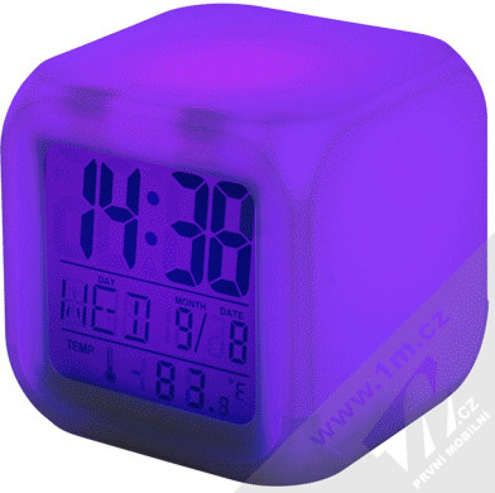 Tento budík vystřídá až 6 různých barev. Má velký a dobře čitelný displej, odložitelný alarm.