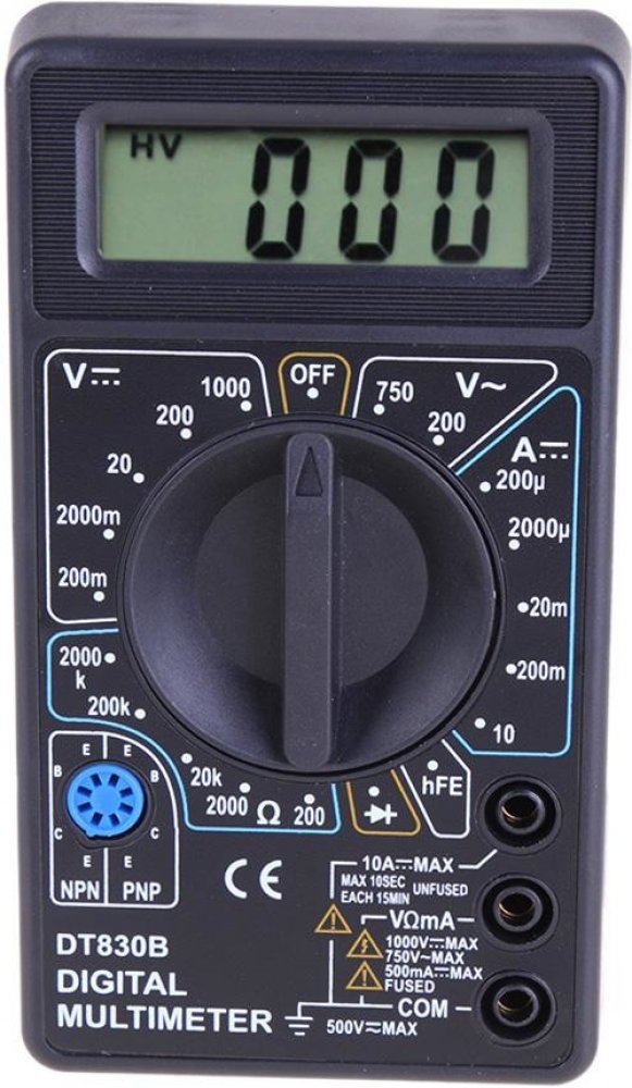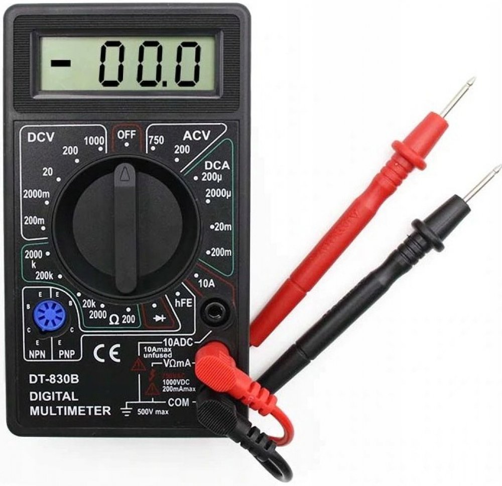 Tento digitální multimetr je nezbytným nástrojem pro každého profesionálního servisního technika. **Navržen v souladu s normou IEC-1010** pro elektronické měřicí přístroje s přepětím CAT II / CAT III a kategorií znečištění 2.Hlavní vlastnosti:Vysoké maximální rozsahy měření stejnosměrného a střídavého proudu a napětí.Automatický spínač zabraňující vybití baterie.Užitečné rozsahy měření pro malé stejnosměrné proudy.Ochranný kryt proti úrazu elektrickým proudem.Měřící schopnosti:Měření stejnosměrného a střídavého napětí.Měření intenzity stejnosměrného proudu.Měření odporu.Měření hFE tranzistorů.Měření vodivostního napětí diody.Sada obsahuje:Továrně nový digitální měřič DT-830B.Sada měřicích kabelů.Baterie 9V 6F22.Originální balení.