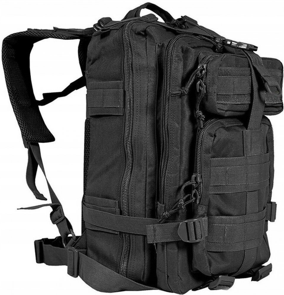 Taktický vojenský batoh na prežitie 30l, čierny Turistický batoh vo vojenskej tematike osloví nadšencov horolezectva ale aj vojenských nadšencov. Systém mnohých praktických vreciek a priehradiek. Perfektné v bojových podmienkach, odporúčané pre milovníkov extrémnych športov a každého, kto trávi čas aktívne. Materiál batohu je vodeodolný, takže môžete vyraziť na výlety aj v nepriaznivom počasí. Je tiež veľmi pevný a odolný voči rôznym druhom oderu. Batoh sa skladá z 5 priehradiek. Hlavná priehradka sa doširoka otvára pomocou predĺženého dvojitého zipsu pre ľahké nakladanie. Okrem toho má batoh dve vnútorné vrecká, jedno zo sieťoviny, druhé na zips. Druhá komora je menšia, v ktorej sú 3 menšie vrecká, z toho dve sú zo sieťoviny. Môžete si tam zabaliť nejaké drobnosti, aby ste ich mohli ľahko vybrať. Predné 2 vrecká umožňujú ľahký a rýchly prístup k tým najpotrebnejším veciam. Spodné predné vrecko má mini organizér (5 malých vreciek), ktorý umožňuje usporiadanie drobností, ako sú perá, kľúče, nože, baterky, zápisníky. Skryté vrecko na zadnej strane je ideálne na uloženie cenného nákladu alebo v súlade s vojenským dizajnom na umiestnenie systému na prenášanie pitnej vody - Hydro Pack. Batoh má nastaviteľné zapínanie v systéme MOLLE, čo umožňuje doplniť tašku o ďalšie vrecká a moduly. Dodatočne vybavená hrudným a bedrovým pásom - umožňuje odľahčiť chrbticu a ramená pri dlhých cestách. Nastaviteľné popruhy sú užitočné najmä pri prenášaní vecí ako sú bundy, stany, karimatky. Bedrový pás má pevnú pracku a nastavenie dĺžky. Po zapnutí opasku je batoh veľmi stabilný, pri nosení sa nenakláňa do strán. Špecifikácie:vyrobené z vysoko kvalitných materiálov kapacita batohu: 30L vystužené nastaviteľné ramenné popruhy zapínanie na patentky zipsy priehradka Hydro-Pack v hornej časti madlo pre pohodlné prenášanie batohu nastaviteľný hrudný popruh zapínaný na patentku nastaviteľný bedrový pás so zapínaním na patentku vetraná výstuž so špongiou na chrbte a ramenných popruhoch vystužený chrbát a prepážka - tepelná izolácia rozmery: cca 43 x 24 x 25 cm farba: čierna Obsah balenia:1 x taktický vojenský batoh na prežitie 30l, čierny