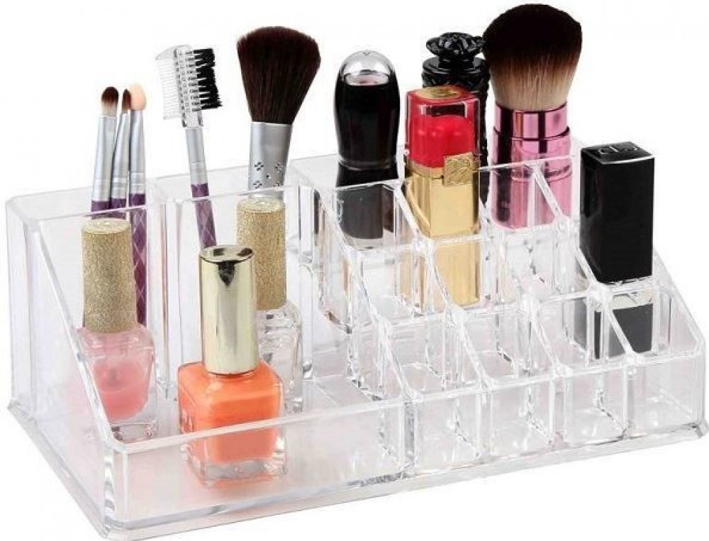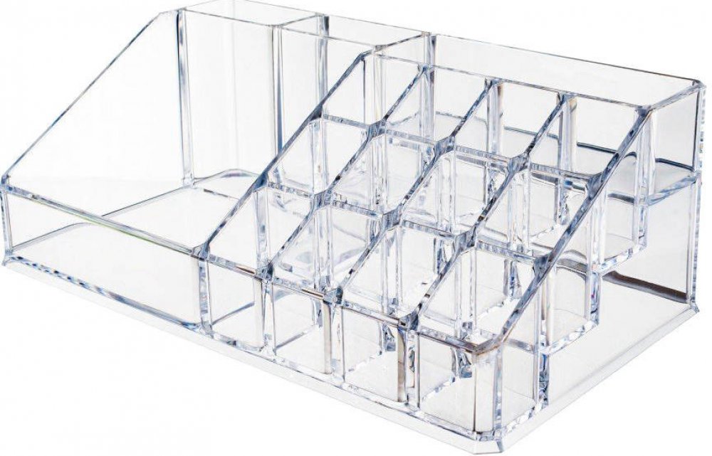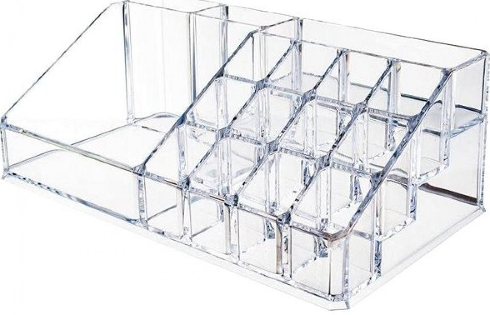 Organizér na kosmetiku je praktickým a nenahraditelným doplňkem v každé ložnici nebo koupelně. Je vyroben z průhledného akrylu s hladce zakončenými okraji. Má mnoho přihrádek vhodných například pro rtěnky, řasenky, štětce, laky na nehty atd.
